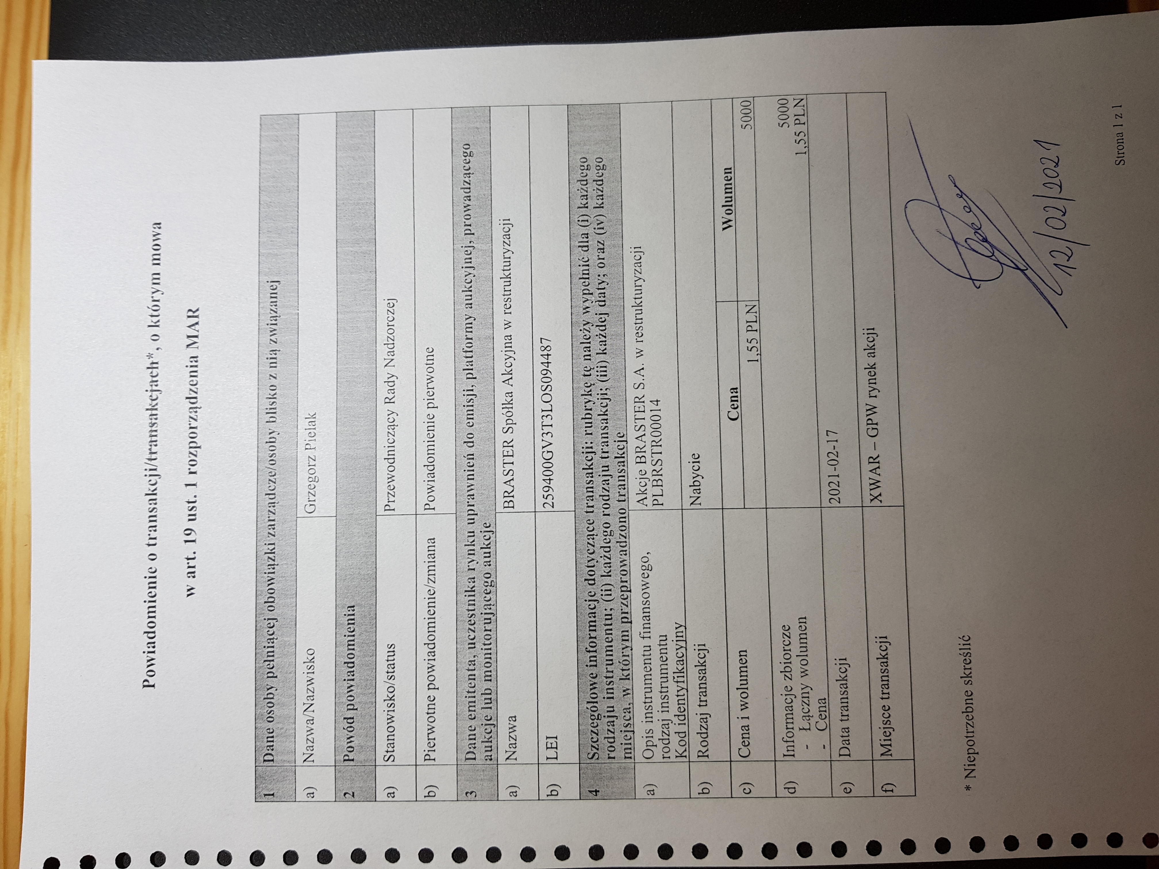 | Zarząd BRASTER S.A. w restrukturyzacji _"Spółka"_ informuje, iż w dniu 17 lutego 2021 r. wpłynęło do Spółki od Pana Grzegorza Pielaka – Przewodniczącego Rady Nadzorczej - zawiadomienie o transakcji nabycia akcji Spółki dokonanych w dniu 17 lutego 2021 roku. Treść ww. zawiadomienia Spółka przekazuje w załączeniu. | |||||||||||