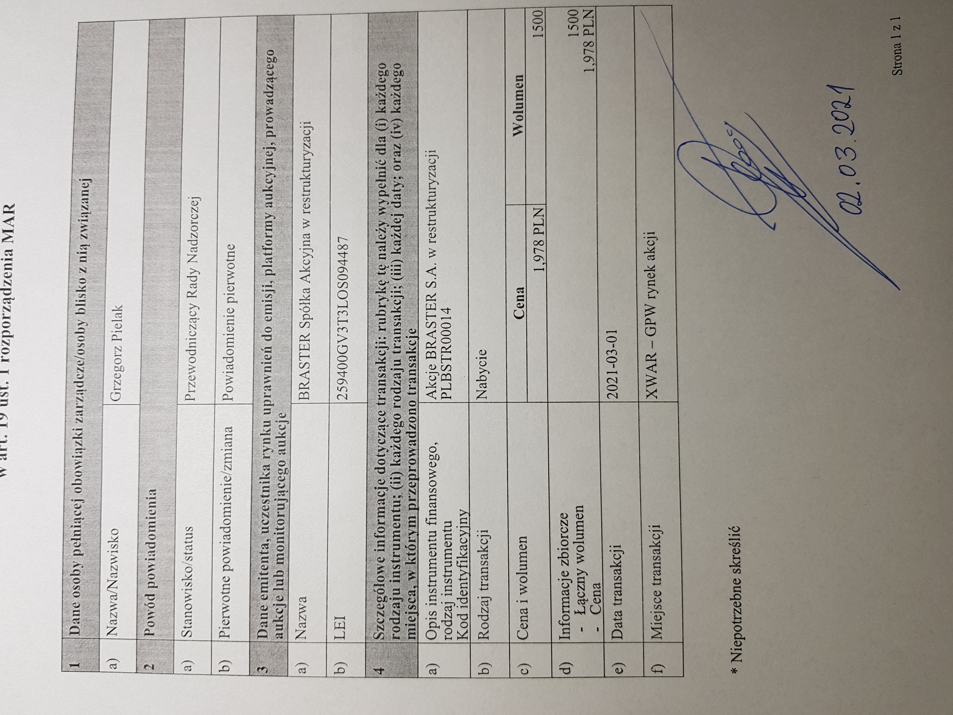 | Zarząd BRASTER S.A. w restrukturyzacji _"Spółka"_ informuje, iż w dniu 2 marca 2021 r. wpłynęło do Spółki od Pana Grzegorza Pielaka – Przewodniczącego Rady Nadzorczej - zawiadomienie o transakcjach nabycia akcji Spółki dokonanych w dniu 1 marca 2021 roku. Treść ww. zawiadomienia Spółka przekazuje w załączeniu. | |||||||||||