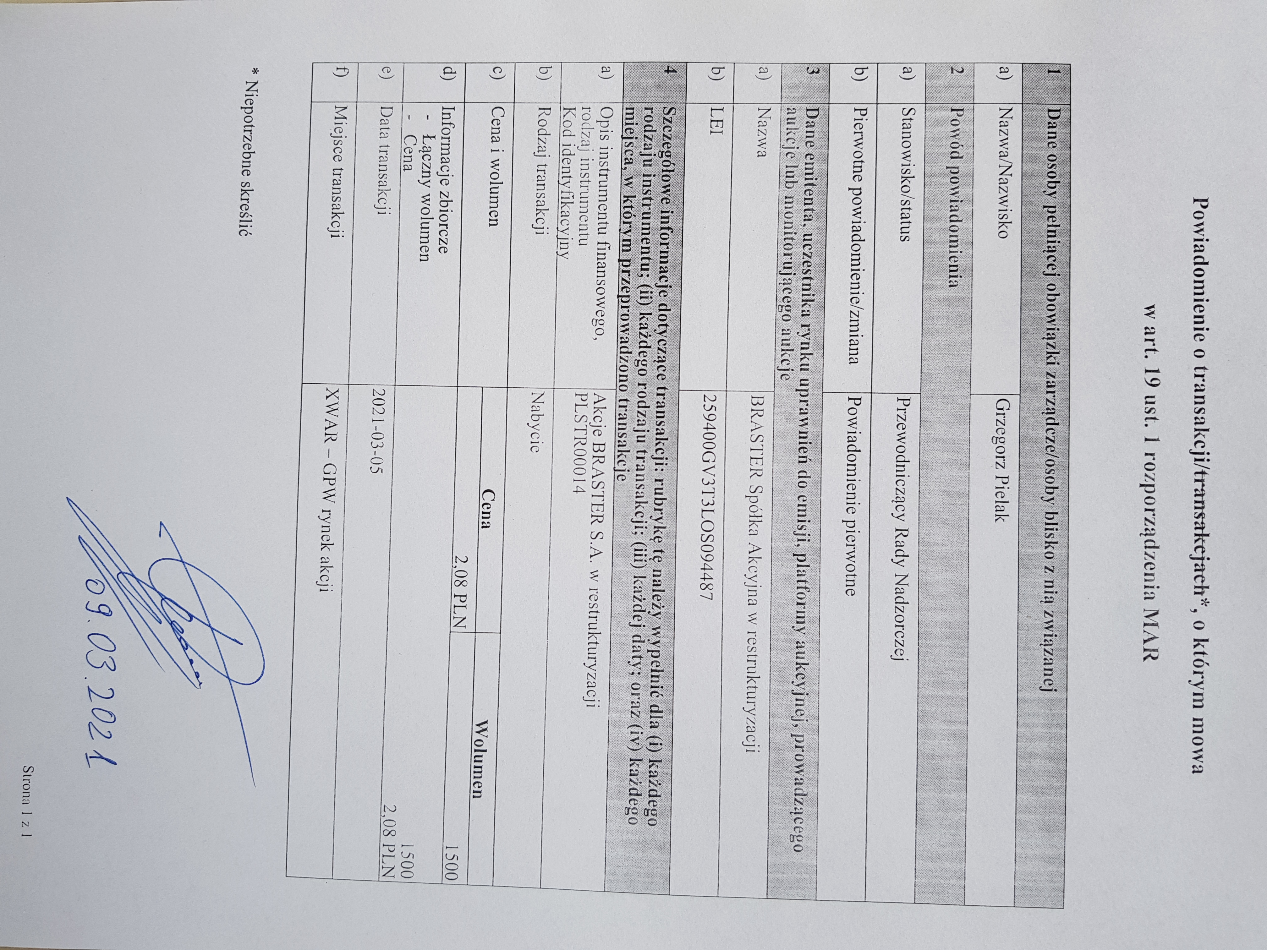 | Zarząd BRASTER S.A. w restrukturyzacji _"Spółka"_ informuje, iż w dniu 9 marca 2021 r. wpłynęło do Spółki od Pana Grzegorza Pielaka – Przewodniczącego Rady Nadzorczej - zawiadomienie o transakcjach nabycia akcji Spółki dokonanych w dniu 5 marca 2021 roku. Treść ww. zawiadomienia Spółka przekazuje w załączeniu. | |||||||||||
