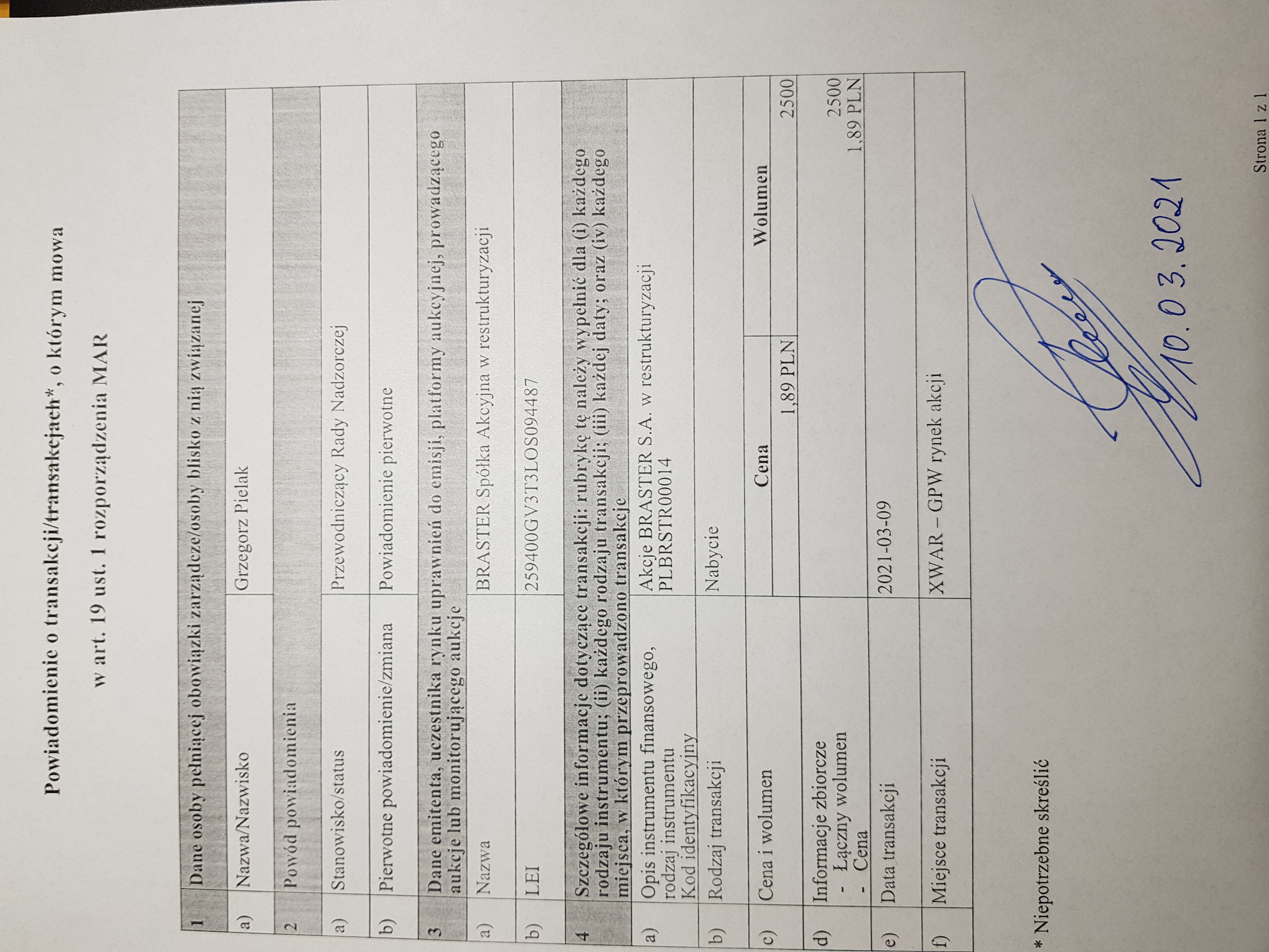 | Zarząd BRASTER S.A. w restrukturyzacji _"Spółka"_ informuje, iż w dniu 10 marca 2021 r. wpłynęło do Spółki od Pana Grzegorza Pielaka – Przewodniczącego Rady Nadzorczej - zawiadomienie o transakcjach nabycia akcji Spółki dokonanych w dniu 9 marca 2021 roku. Treść ww. zawiadomienia Spółka przekazuje w załączeniu. | |||||||||||