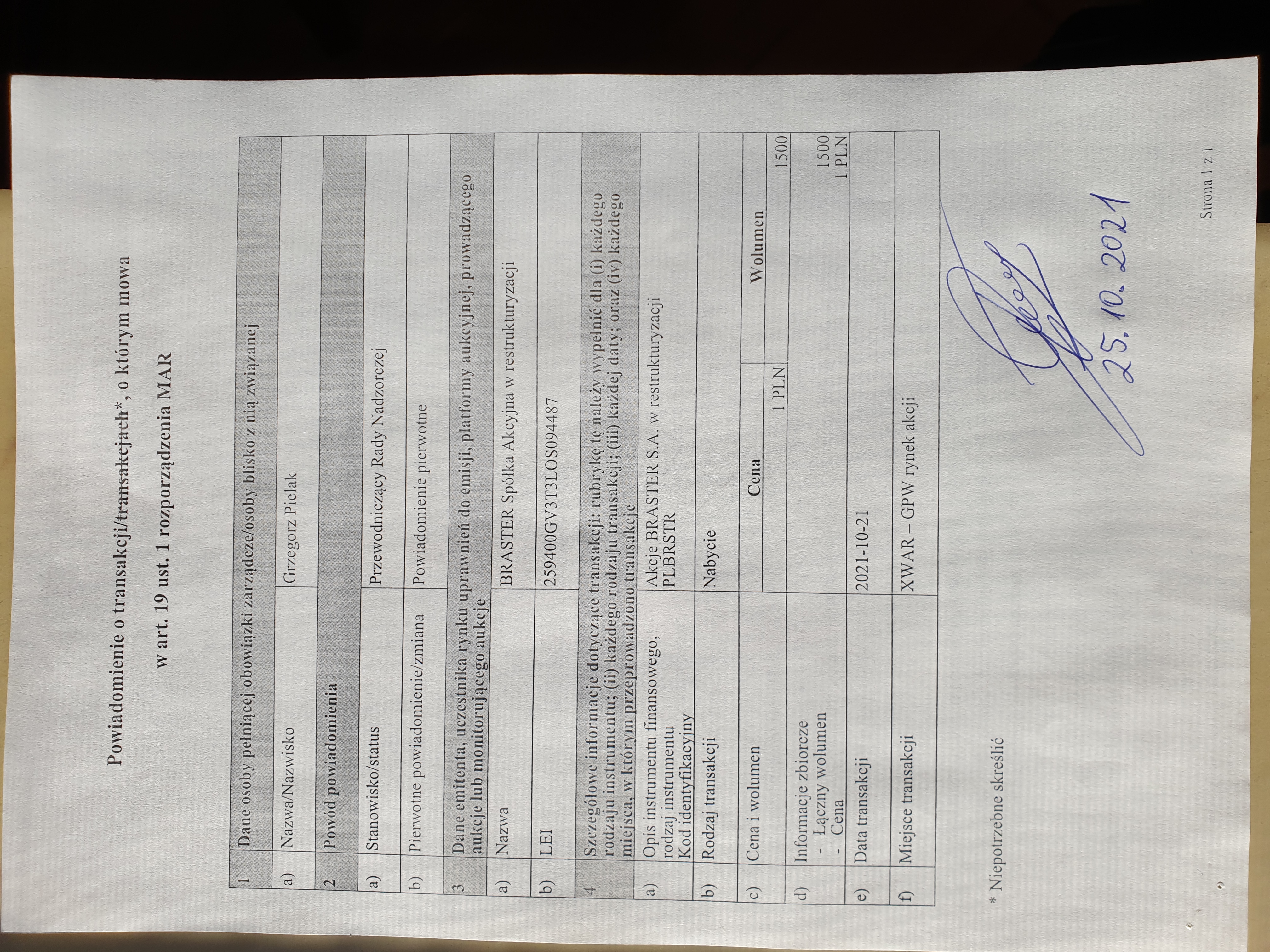 | Zarząd BRASTER S.A. w restrukturyzacji _"Spółka"_ informuje, iż w dniu 25 października 2021 r. wpłynęło do Spółki od Pana Grzegorza Pielaka - Przewodniczącego Rady Nadzorczej - zawiadomienie o transakcjach nabycia akcji Spółki dokonanych na sesji w dniu 21 października 2021 roku. Treść ww. zawiadomienia Spółka przekazuje w załączeniu. | |||||||||||