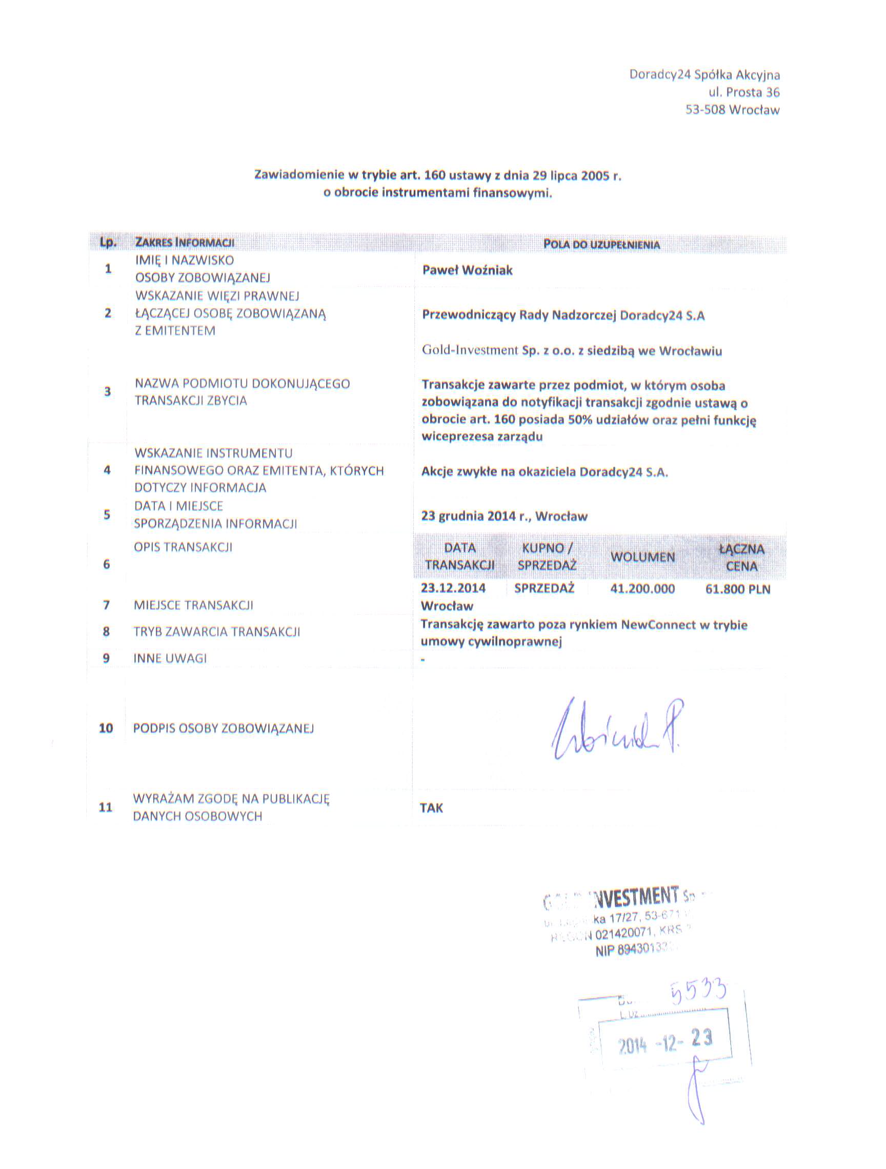 | Zarząd spółki Doradcy24 S.A. (dalej: Emitent) informuje o otrzymaniu dnia 23 grudnia 2014 roku zawiadomienia w trybie art. 160 ustawy o obrocie instrumentami finansowymi od Przewodniczącego Rady Nadzorczej Doradcy24 S.A. Pana Pawła Woźniaka. Emitent w załączeniu przekazuje otrzymane zawiadomienie. |