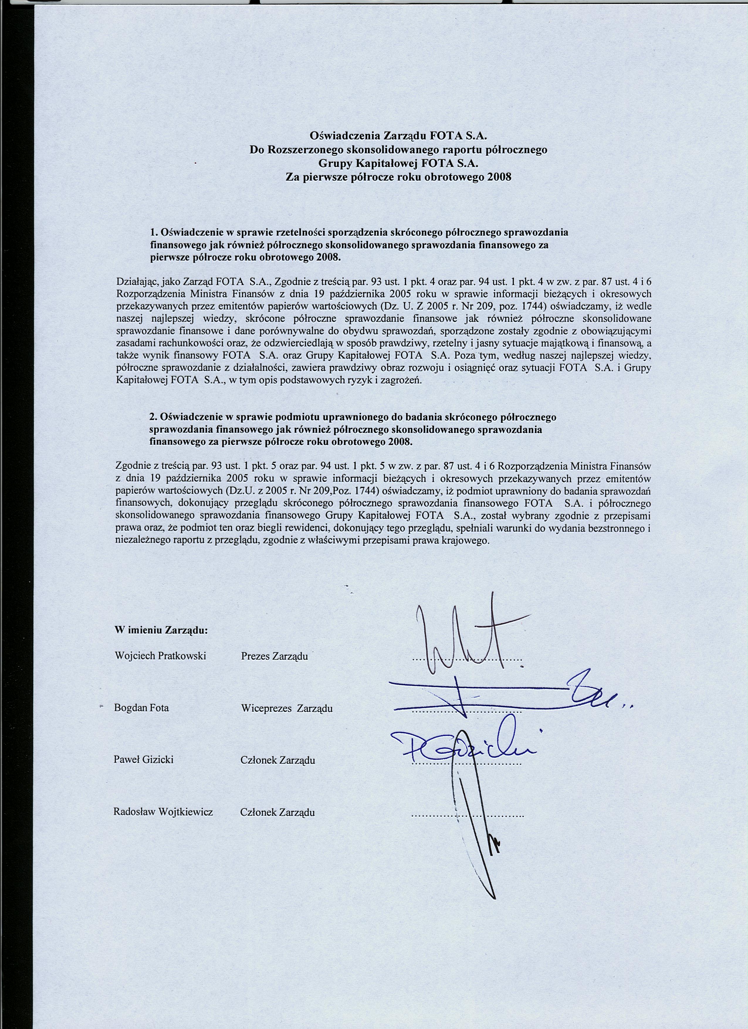 | Zarząd FOTA S.A. (Emitent) uzupełnia rozszerzony skonsolidowany raport finansowy za I półrocze 2008 roku o oświadczenia Zarządu wymagane przepisami § 94 ust. 1 pkt 4 i 5 Rozporządzenia Ministra Finansów z dnia 19 października 2005 roku w sprawie informacji bieżących i okresowych przekazywanych przez emitentów papierów wartościowych (Dz. U. Nr 209, poz. 1744). Oświadczenia stanowią załącznik do niniejszego raportu. | |||||||||||