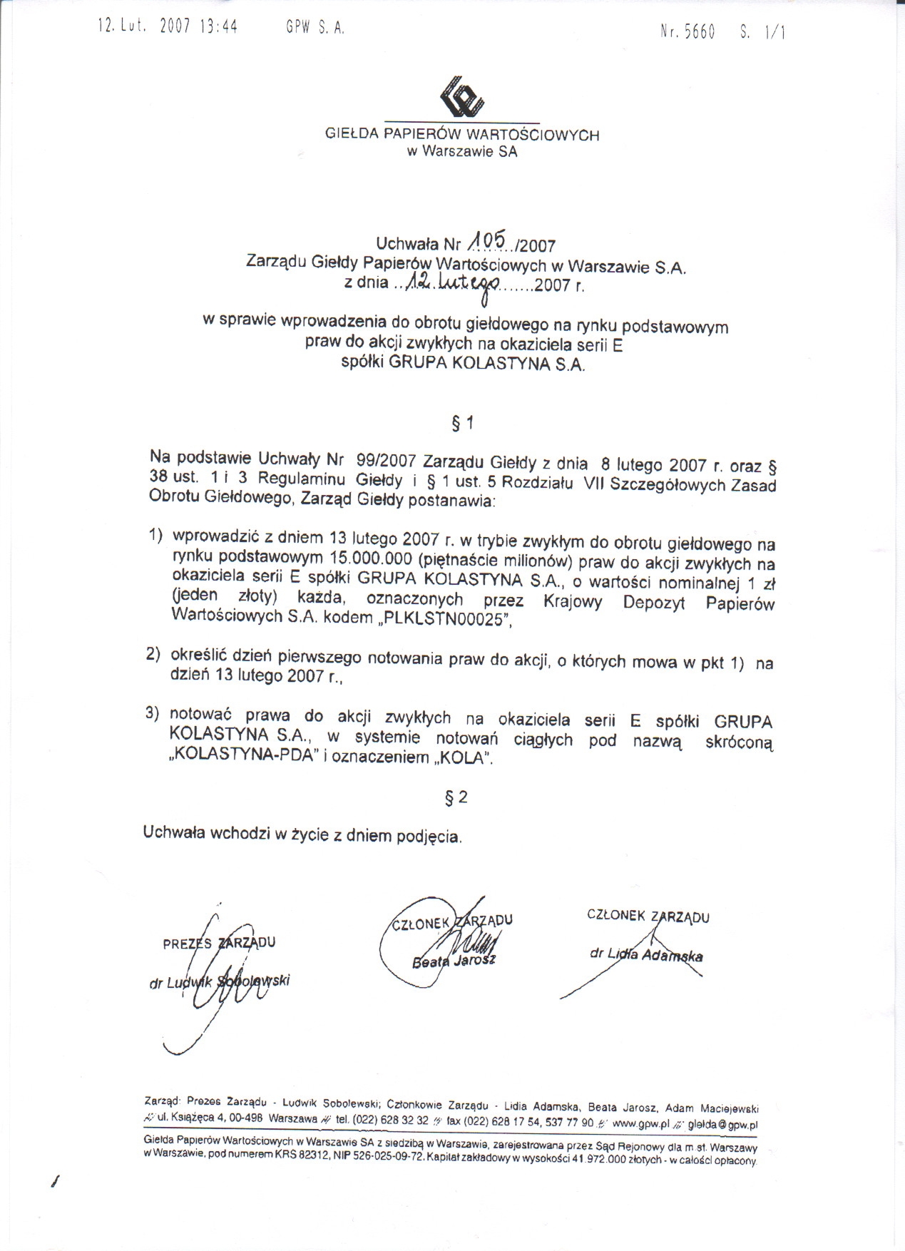Zarząd spółki GRUPA KOLASTYNA S.A. informuje, iż w dniu 12 II 2007 Zarząd Giełdy Papierów Wartościowych w Warszawie S.A. uchwałą nr 105/2007 postanowił : 1. Wprowadzić z dniem 13 lutego 2007 r. w trybie zwykłym do obrotu giełdowego na rynku podstawowym 15.000.000 (piętnaście milionów) praw do akcji zwykłych na okaziciela serii E spółki GRUPA KOLASTYNA S.A., o wartości nominalnej 1 zł (jeden złoty) każda, oznaczonych przez Krajowy Depozyt Papierów Wartościowych S.A. kodem "PLKLSTN00025" 2. Określić dzień pierwszego notowania praw do akcji, o których mowa w pkt 1. na dzień 13 lutego 2007 3. Notować prawa do akcji zwykłych na okaziciela serii E spółki GRUPA KOLASTYNA S.A. w systemie notowań ciągłych pod nazwą skróconą "KOLASTYNA-PDA" i oznaczeniem "KOLA" |
