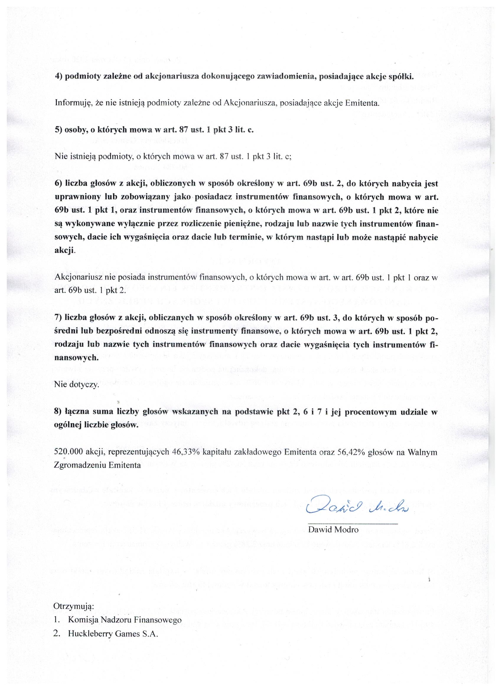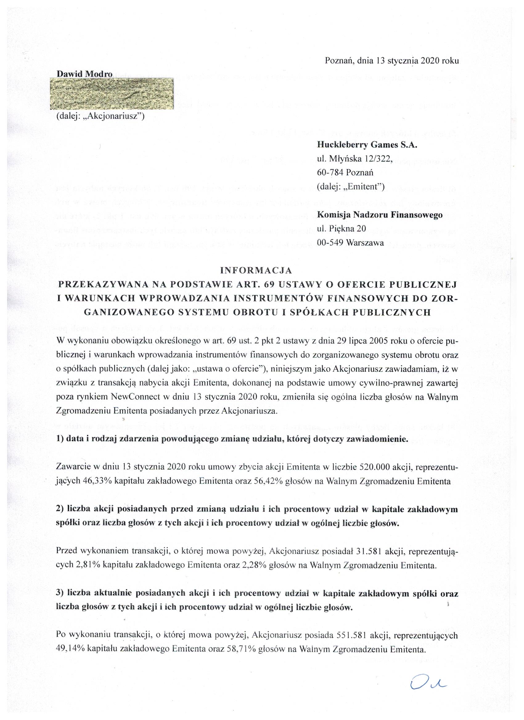 | Na podstawie art. 70 pkt 1 ustawy o ofercie publicznej i warunkach wprowadzania instrumentów finansowych do zorganizowanego systemu obrotu oraz o spółkach publicznych („ustawa o ofercie”) Zarząd Huckleberry Games S.A. z siedzibą w Poznaniu informuje o otrzymaniu w dniu 13 stycznia 2020 roku zawiadomienia sporządzonego na podstawie art. 69 ustawy o ofercie od akcjonariusza Dawida Modro Emitent w załączeniu przekazuje zawiadomienie, o którym mowa powyżej. |