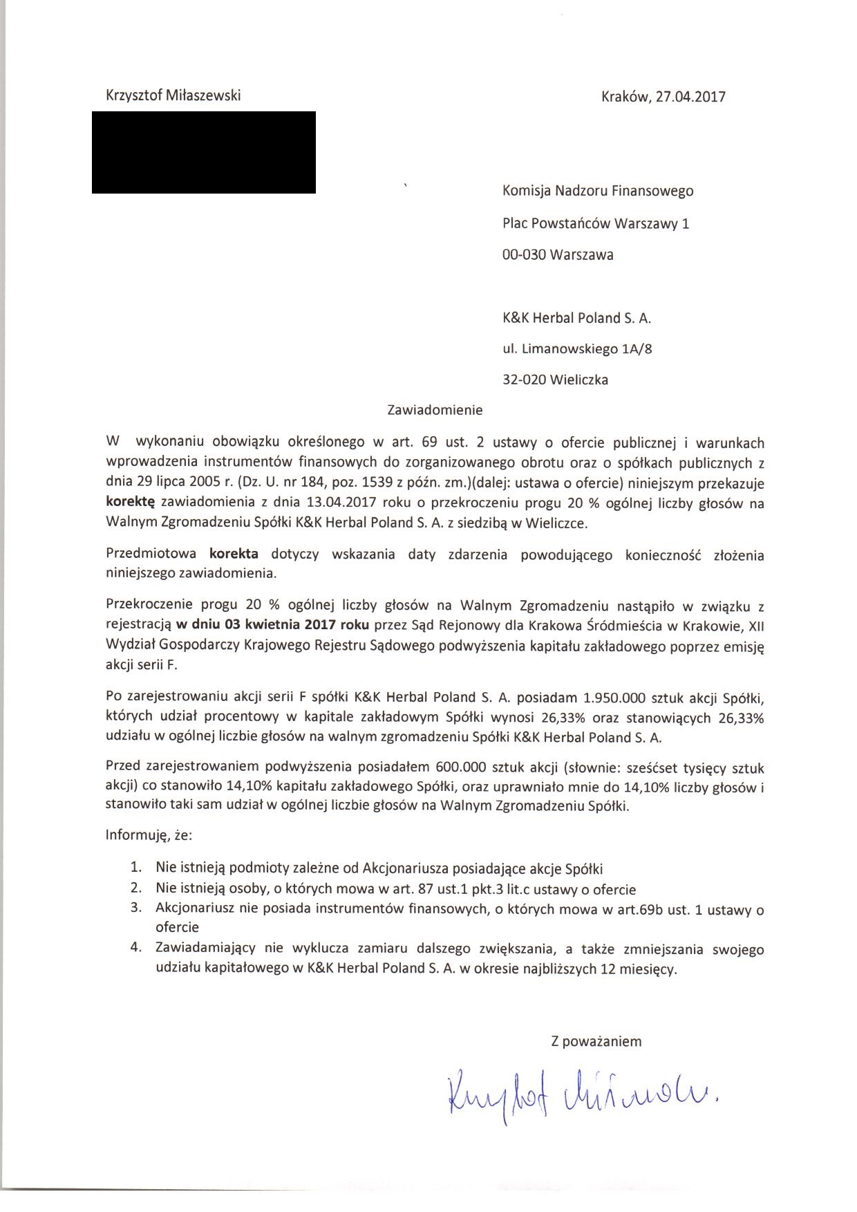 | Zarząd K&K Herbal Poland S.A. z siedzibą w Wieliczce informuje, że w dniu 27 kwietnia 2017 roku otrzymał od Pana Krzysztofa Miłaszewskiego uzupełnienie zawiadomienia w trybie art. 69 ustawy z dnia 29 lipca 2005 r. o ofercie publicznej i warunkach wprowadzania instrumentów finansowych do zorganizowanego systemu obrotu oraz o spółkach publicznych z dnia 13.04.2017 roku. Uzupełniona została data zdarzenia powodującego konieczność złożenia zawiadomienia. Treść powiadomienia stanowi załącznik do niniejszego raportu. |