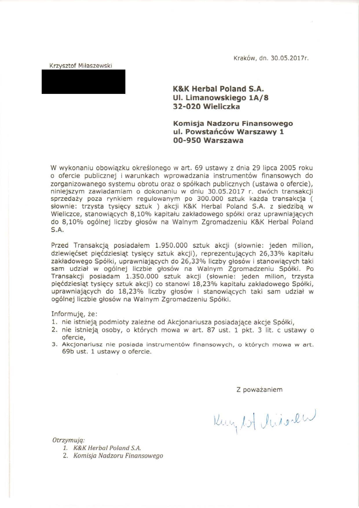 | Zarząd K&K Herbal Poland S.A. z siedzibą w Wieliczce informuje, że w dniu 30 maja 2017 roku Emitent otrzymał od Pana Krzysztofa Miłaszewskiego powiadomienie w trybie art. 69 ustawy z dnia 29 lipca 2005 r. o ofercie publicznej i warunkach wprowadzania instrumentów finansowych do zorganizowanego systemu obrotu oraz o spółkach publicznych, o zmniejszeniu przez niego zaangażowania w ogólnej liczby głosów na Walnym Zgromadzeniu Spółki. | |||||||||||
