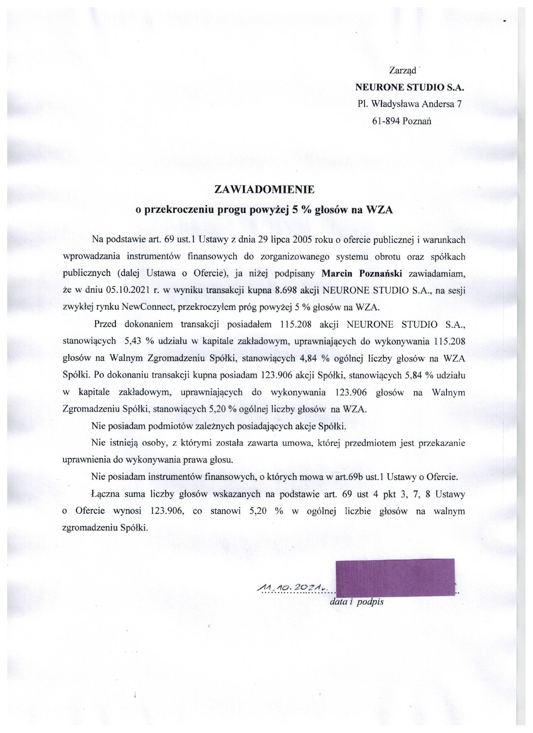 | Zarząd Spółki Neurone Studio S.A. z siedzibą w Poznaniu („Spółka”, „Emitent”) niniejszym przekazuje do publicznej wiadomości informację, że w dniu 11 października 2021 roku do Spółki wypłynęło zawiadomienie z art. 69 ustawy o ofercie publicznej o zwiększeniu udziału w ogólnej liczbie głosów Emitenta powyżej progu 5% Treść przedmiotowego zawiadomienia przedstawiono w załączeniu do niniejszego raportu. |
