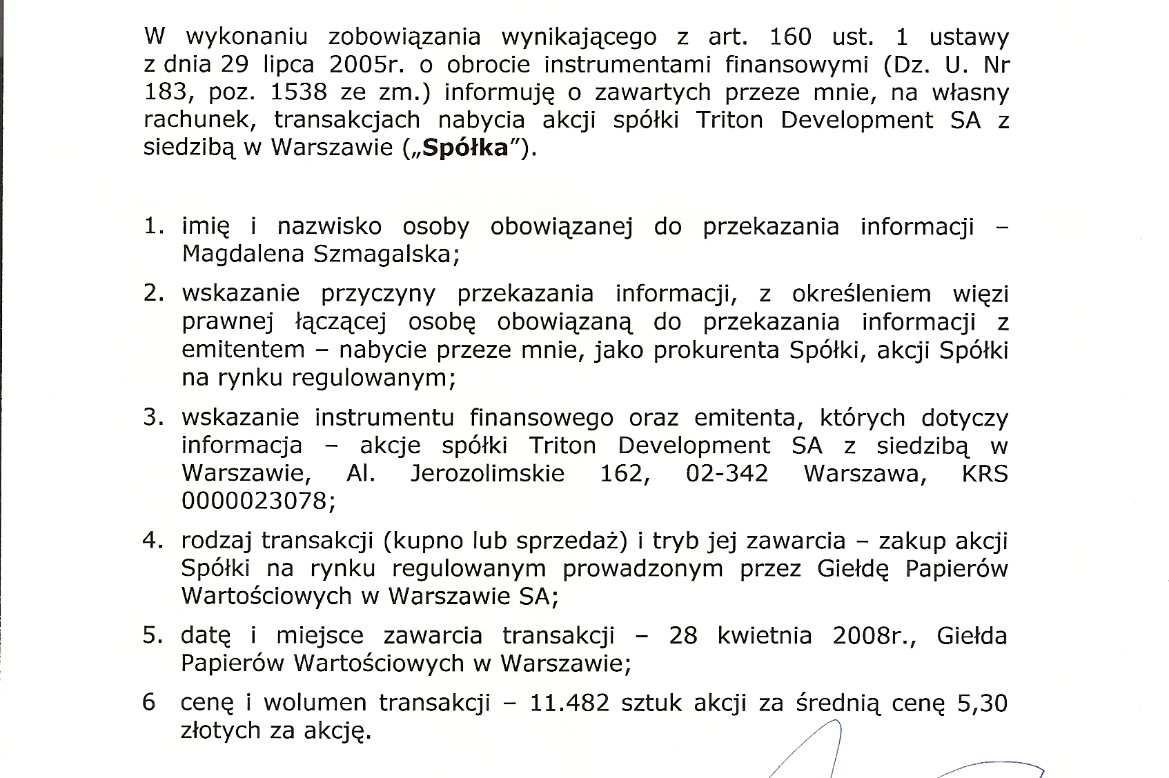 | Art. 160 ust 4 Ustawy o obrocie - informacja o transakcjach osób mających dostęp do informacji poufnych |