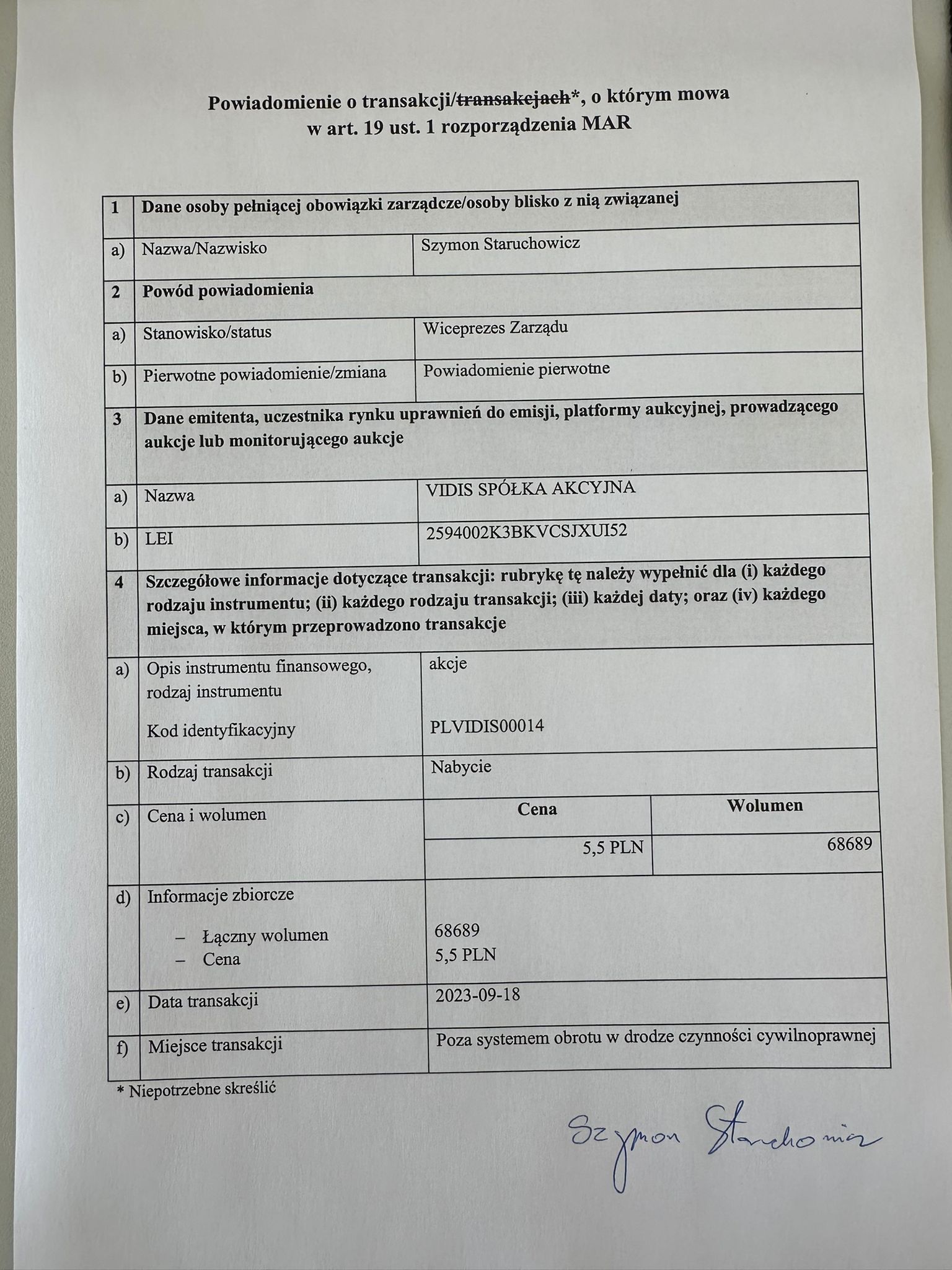 | Zarząd VIDIS S.A. z siedzibą w Bielanach Wrocławskich (dalej także jako: "Spółka") informuje, że w dniu wczorajszym Spółka otrzymała od Szymona Staruchowicza powiadomienie dotyczące transakcji na akcjach Spółki. W załączeniu Zarząd przekazuje treść otrzymanego powiadomienia. | |||||||||||
