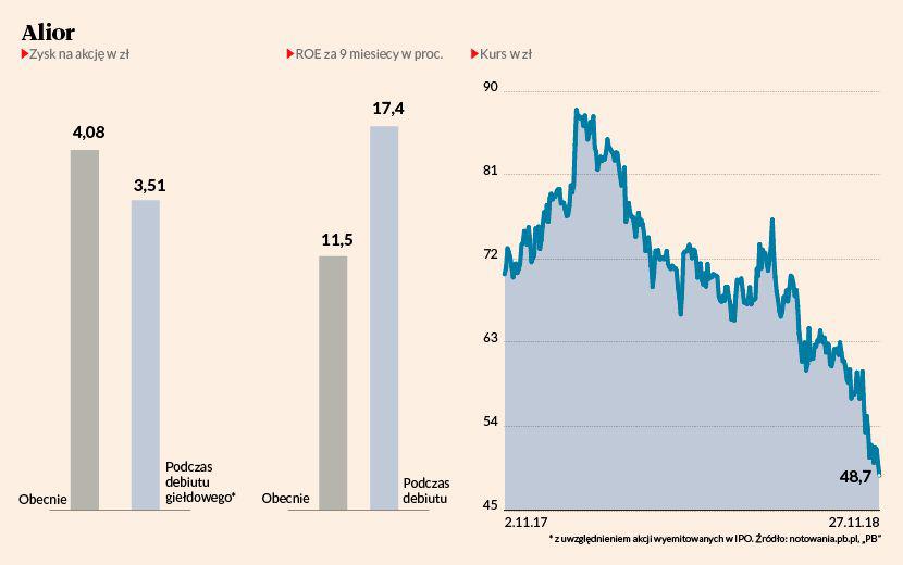 W sobotę 17 listopada minęła dziesiąta rocznica uruchomienia Alior Banku. W piątek 14 grudnia minie sześć lat od jego giełdowego debiutu. Niewielkie są jednak szanse, że minie on inwestorom w szampańskich nastrojach. W ciągu ostatnich 12 miesięcy kurs akcji spadł o 32 proc. Do wczoraj żaden z analityków nie wyceniał jednak banku na mniej niż 71 zł za akcję, a najwyższa wycena opiewała na 97 zł. Co prawda 27 listopada analityk Morgana Stanleya zmienił swoją wycenę z 80,50 zł na 63 zł, ale na giełdzie akcje można było kupić za nieco ponad 48 zł. Gorzej było tylko w końcówce 2016 r., gdy spekulowano o przejęciu przez Alior Raiffeisen Banku Polska.