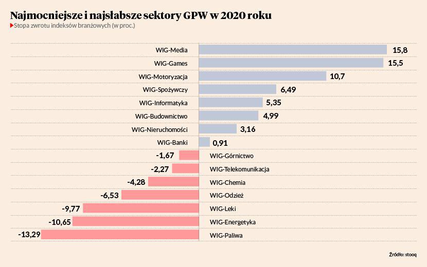 Druga cecha wspólna to rodzaj działalności, który spółki te uprawiają. Energetyka, chemia, górnictwo, paliwa — wszystko to przemysł ciężki. Wśród indeksów branżowych i w tym, i w ubiegłym roku widać zresztą rozłam na przemysł i usługi. Najlepiej w 2020 r. radzą sobie media i gry, najsłabiej paliwa i energetyka. W gronie rosnących indeksów znalazł się także WIG-Motoryzacja, jednak jest to zasługa dystrybutorów części, a nie ich producentów.