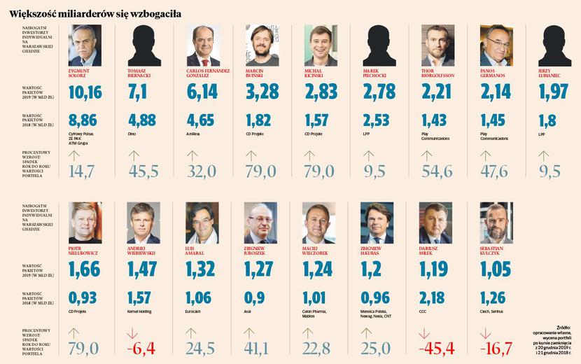 Bywało ich już więcej, miewali bardziej imponujące majątki, ale miliarderzy z GPW pod koniec 2019 r. nie mają powodów do narzekań — a przynajmniej większość z nich. W przygotowywanym co roku przez „Puls Biznesu” rankingu giełdowych miliarderów jest siedemnaście nazwisk — o pięć mniej niż w rekordowym 2017 r., ale o dwa więcej niż rok wcześniej. W porównaniu z poprzednią edycją na liście pojawiły się trzy nowe twarze, a zniknął jeden inwestor — ten najmłodszy. Na liście jest kilku obcokrajowców, nie ma żadnych kobiet, młode wilki przeskakują starych weteranów, ale jest jedno, co się na niej od lat nie zmienia — lider.