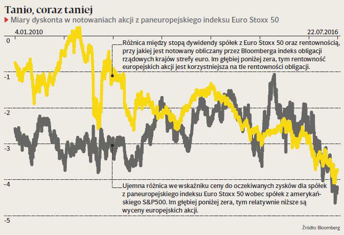 — Wszystko wskazywało, że Europa będzie radzić sobie świetnie, jednak te nadzieje się nie spełniły — komentowała w rozmowie z Bloombergiem Caroline Simmons, szefowa inwestycji w towarzystwie UBS Wealth Management na Wielką Brytanię. W rezultacie odpływów dyskonto w wycenach na europejskich rynkach rozwiniętych wobec USA sięgnęło na początku lipca najwyższego poziomu od co najmniej 11 lat, za który to okres dostępne są porównywalne dane. Wskaźnik ceny do oczekiwanych zysków dla spółek z paneuropejskiego benchmarku jest obecnie aż o 4,26 punktu niższy od analogicznego wskaźnika dla emitentów z amerykańskiego indeksu S&P500 (to oznacza, że wyceny w Europie są niższe o około jednej czwartej). Akcje ze Starego Kontynentu równie tanie jak wobec odpowiedników z innych regionów wydają się na tle obligacji skarbowych krajów strefy euro. Stopa dywidendy spółek z Euro Stoxx 50 przekracza rentowności obligacji z indeksu Bloomberg Eurozone Sovereign Bond aż o 3,62 punktu procentowego, niewiele mniej niż zanotowany po brexicie rekord.