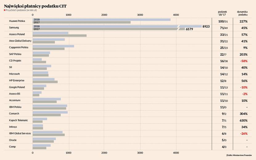 Spośród firm technologicznych najwięcej CIT wpłacił do budżetu Huawei Polska — blisko 100 mln zł, czyli ponadtrzykrotnie więcej niż w 2017 r. Przychody chińskiego giganta wzrosły w tym czasie o 41 proc. do 3,85 mld zł. Drugi był Samsung Electronics Polska, który zasilił państwową kasę 71 mln zł CIT (o 46 proc. więcej niż w 2017 r.). Według danych MF koreańska spółka zanotowała w ubiegłym roku 8,9 mld zł przychodów wobec 6,6 mld zł rok wcześniej. Samsung w raporcie rocznym podaje jednak, że jego przychody spadły w ubiegłym roku o 1 proc. do 6,44 mld zł. W tym roku spodziewa się wzrostu.