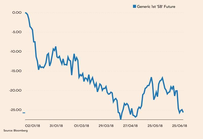 Konsumenci coraz mniej chętnie spożywają cukier, a firmy reagują na to zmniejszając jego zawartość w produktach. Choć globalna konsumpcja cukru wciąż rośnie, to tempo tego wzrostu spowolniło do średnio 1,4 proc. w ostatnich sezonach. Przez ostatnią dekadę wynosiło 1,7 proc., podają eksperci z Green Pool Commodity Specialists. W tym samym czasie produkcja cukru szybko rośnie, głównie w Indiach, które już są drugie pod tym względem na świecie. W efekcie eksperci spodziewają się rekordowych globalnych zapasów cukru w obecnym sezonie, a także następnym roku.