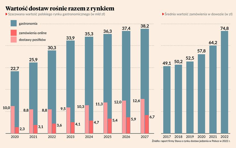 Choć nastroje w branży gastronomicznej wciąż jeszcze po pandemii nie są najlepsze, to zdecydowanie rynek dostaw jedzenia ma przed sobą ciekawe perspektywy rozwoju. Według naszych prognoz za cztery lata wartość wyłącznie dostaw zakupów i jedzenia osiągnie wartość 12,6 mld zł. Część sektora dotycząca zamówień online natomiast wzrośnie o blisko 87 proc. — z 3,6 mld zł z końca 2022 r. do 6,7 mld zł w 2027 r. W 2022 r. w branży food delivery spadek udziału w polskim rynku odnotowały m.in. Pyszne.pl, Uber Eats czy własne kanały dostaw. Jedyną platformą, która w minionym roku wypracowała wzrost udziału w rynku, o 6,4 proc., było Glovo. Mimo tych zmian pozycję lidera pod kątem liczby zrealizowanych zamówień wciąż zajmuje Pyszne.pl. Co warto podkreślić — wzrost liczby dostaw nie zawsze jest jednoznaczny z rosnącą wartością rachunków.