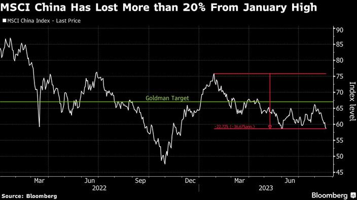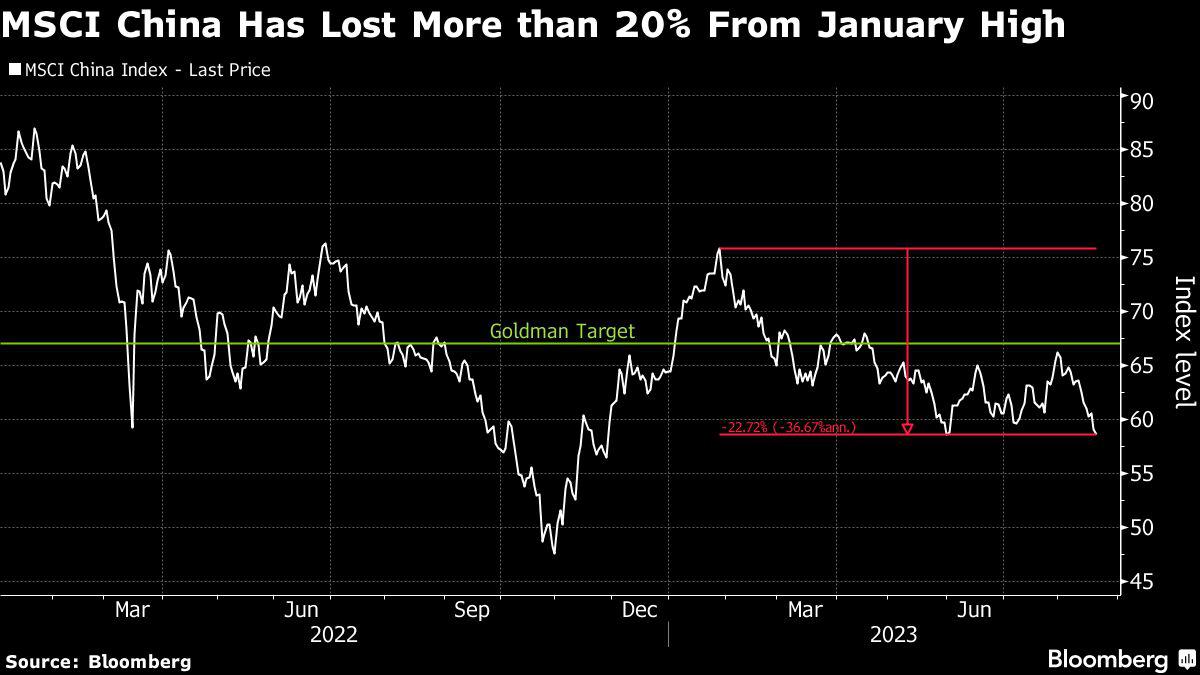 Goldman Sachs obniżył cel dla MSCI China do 70 z 80 w czerwcu, powołując się na obawy dotyczące zysków i wartości chińskiej waluty.