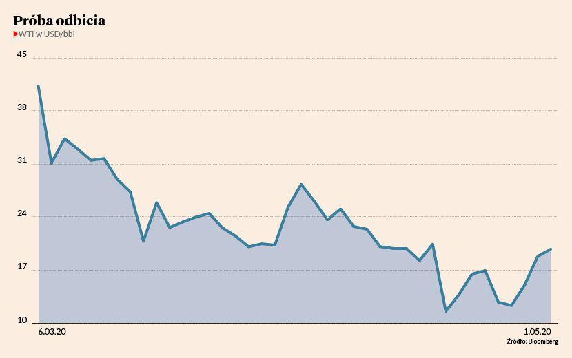 Ropa Brent taniała w poniedziałek o 1,3 proc. do 26,10 USD. Kurs ropy WTI spadał w pierwszej części sesji nawet o 6 proc., by później odbić i powrócić ponad poziom 20 USD za baryłkę. Przyczyniły się do tego informacje o niższym niż oczekiwano przyroście zapasów w Cushing w Oklahomie. Firma Genscape podała, że zapasy wzrosły o 1,8 mln baryłek. Jeśli podobne dane przedstawi amerykański rząd, będzie to oznaczało najmniejszy przyrost od połowy marca.