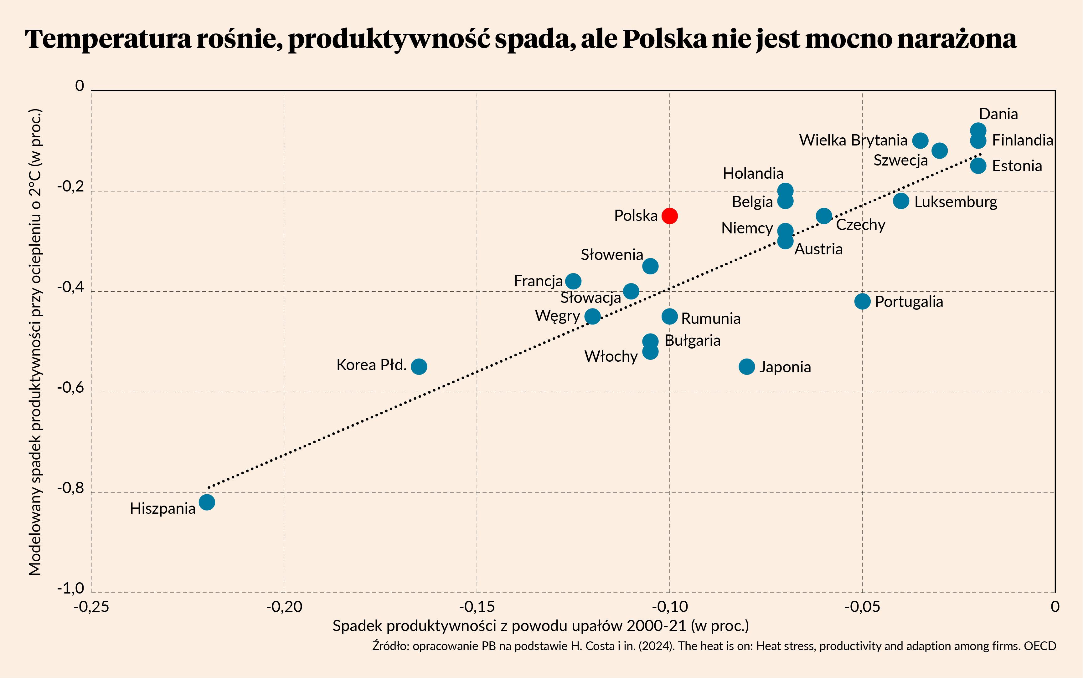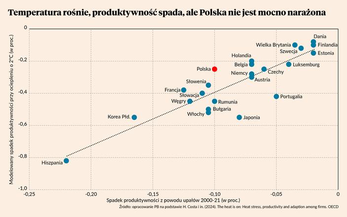 Polska należy do krajów relatywnie mniej narażonych – co przedstawia wykres – jednak ten negatywny wpływ nas nie omija. Z badania wynika, że wzrost liczby upałów w XXI w. obniżył już wydajność pracy o 0,1 proc., natomiast wskutek ocieplenia o 2 stopnie Celsjusza w przyszłości produktywność może zmniejszyć się o kolejne 0,25 proc. Najbardziej dotknięte kraje to Hiszpania i Korea. W tym pierwszym kraju wydajność może spaść w przyszłości aż o 0,8 proc., a w kraju azjatyckim o blisko 0,6 proc. Wysoka ekspozycja Korei na negatywne zmiany klimatu wynika z wysokiego stopnia urbanizacji, czyli dużej koncentracji ludności w miastach. To tworzy tzw. miejskie wyspy ciepła wzmacniające skutki wysokich temperatur.