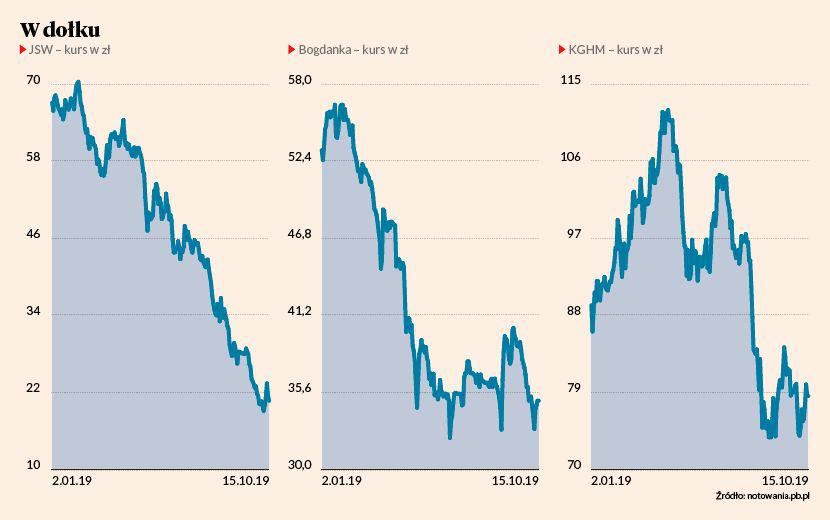 Zdominowanie indeksu WIG- -Górnictwo przez KGHM sprawia, że nie jest on dobrym miernikiem nastrojów w branży. Sytuacja innych dużych górniczych spółek z GPW jest jednak w pewnym sensie podobna do tego, co dzieje się w lubińskim kombinacie. I Bogdance, i JSW ciążyła presja ze strony taniejącego surowca, która teraz nieco zelżała. Perspektywy tych spółek wciąż nie są jednak różowe. Po wynikach tej dwójki widać już zresztą spowolnienie. W opublikowanym 15 października raporcie bieżącym Bogdanka poinformowała, że jej szacunkowy zysk w III kwartale 2019 r. wyniósł 66,2 mln zł. Rok do roku to wprawdzie wzrost aż o 579 proc., w I i II kwartale 2019 r.