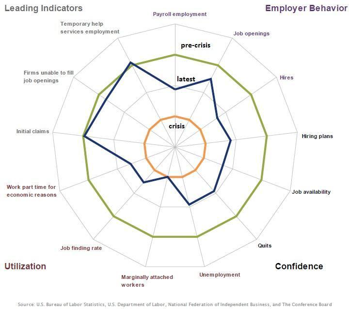 Odczyty dotyczące zachowań pracodawców znajdują się w połowie drogi od kryzysu do normalnej koniunktury, a tym opisującym nastroje w gospodarce i wykorzystanie mocy produkcyjnych wciąż bliżej do stanów z kryzysu. Całość strat odrobiły jednak wskaźniki wyprzedzające koniunkturę (takie jak ilość wniosków o zasiłek, czy aktywność na rynku pracy tymczasowej), a to świetny prognostyk dla inwestorów.