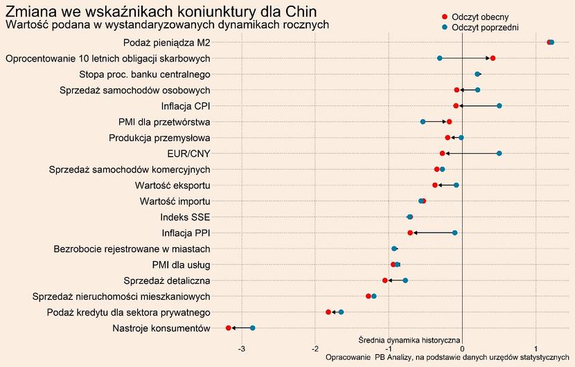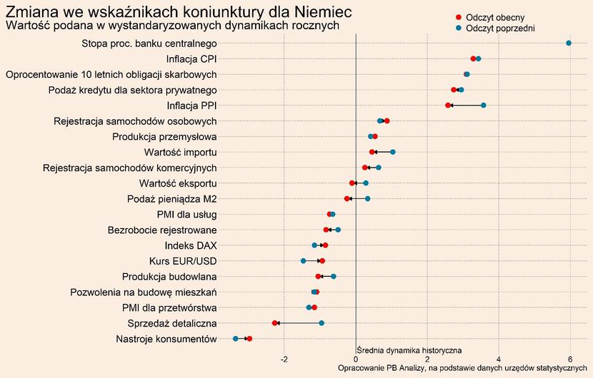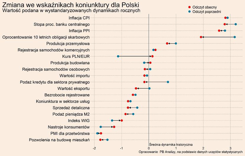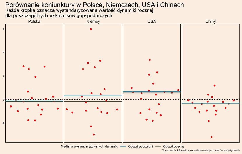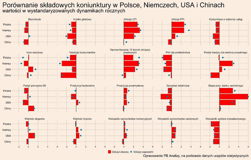 Przegląd najistotniejszych wskaźników makroekonomicznych dla Polski oraz trzech najważniejszych światowych gospodarek – USA, Niemiec i Chin (po 20 wskaźników z każdego kraju, wszystkie wskaźniki można obserwować i pobierać na naszej platformie danych PB Analizy) – pozwala zaprezentować z lotu ptaka kluczowe trendy. Wskaźniki podajemy w wystandaryzowanej dynamice rocznej, czyli jako odchylenie rocznej dynamiki od średniej, skorygowane o zmienność. Dzięki temu możemy porównywać dane o różnych cechach statystycznych i pokazywać odchylenia od długookresowego trendu.