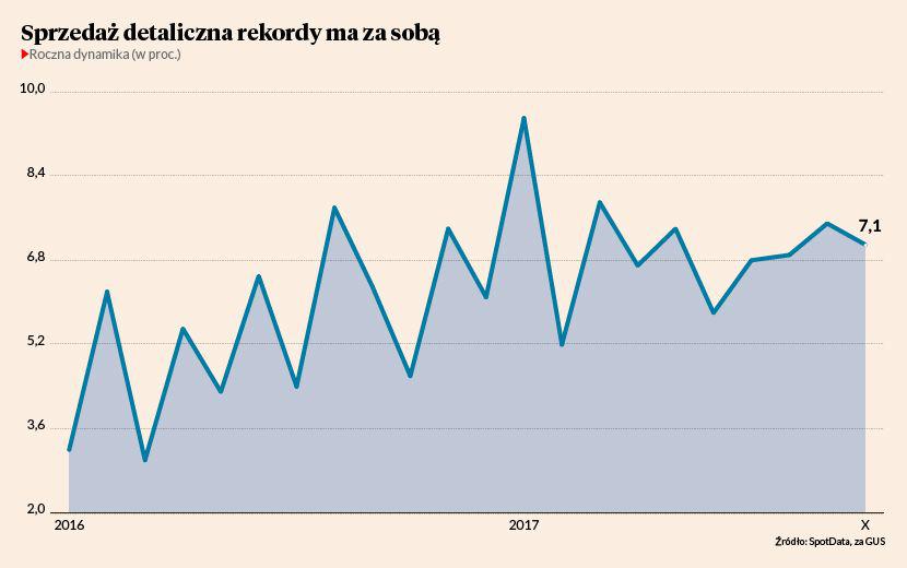 W październiku sprzedaż detaliczna w ujęciu realnym wzrosła o 7,1 proc. r/r, a więc nieco słabiej od rynkowego konsensu, który zakładał powtórzenie wyniku sprzed miesiąca (7,5 proc.). Całościowy obraz polskiej gospodarki, który wyłania się z październikowych danych, jest jednak pozytywny.