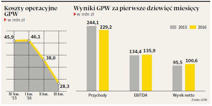 — GPW jako spółka zaskakująco dobrze sobie radzi, jeśli chodzi o wyniki finansowe — wtóruje mu Jaromir Szortyka, analityk PKO Banku Polskiego. Przychody GPW w pierwszych dziewięciu miesiącach 2016 r. wyniosły 229,2 mln zł. To 6,1 proc. mniej niż rok wcześniej. Zysk netto wzrósł jednak o 5,4 proc. — do 100,6 mln zł. Wzrosła także EBITDA — 1,1 proc. na plusie przekłada się na 135,9 mln zł.