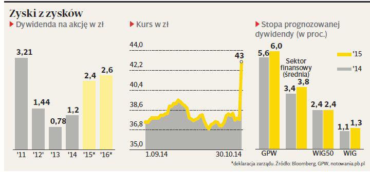 Kiedy w listopadzie 2010 r. akcje GPW debiutowały na GPW, ówczesny prezes Ludwik Sobolewski deklarował jasno: „Będziemy spółką dywidendową”. Kupno nowego systemu transakcyjnego i plany mariażu z giełdą wiedeńską wpłynęły jednak na zmianę polityki dywidendowej, co zepchnęło akcje spółki do drugiej ligi pod względem hojności dla akcjonariuszy. W ostatnich dwóch latach GPW nie wypłacała wysokich dywidend — w 2012 r. na akcje przypadło 0,78 zł, w roku ubiegłym 1,2 zł. Przy kursie z dnia wypłaty zysku to dało stopy 2 i 3,3 proc. stopy dywidendy.
