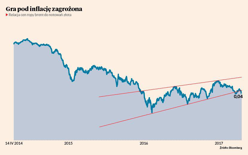 Relacja notowań ropy naftowej brent do cen złota spadła w ostatnich dniach poniżej dolnego ograniczenia klina, który opisywał kilkanaście miesięcy dynamicznego odbicia na ropie. Jeżeli wybicie w dół okaże się trwałe, będzie to zapowiadało dalsze osłabianie się ropy na tle złota, czemu towarzyszyłoby gorsze zachowanie akcji na tle obligacji. Jeżeli mimo to wsparcie zostanie ostatecznie obronione (na co wciąż są szanse), to na wykresie relacji cen ropy i złota należałoby się spodziewać ruchu do górnego ograniczenia klina. W takim wypadku rynki czekałaby jeszcze co najmniej jedna fala gry pod inflację, a więc i umocnienia akcji na tle obligacji.