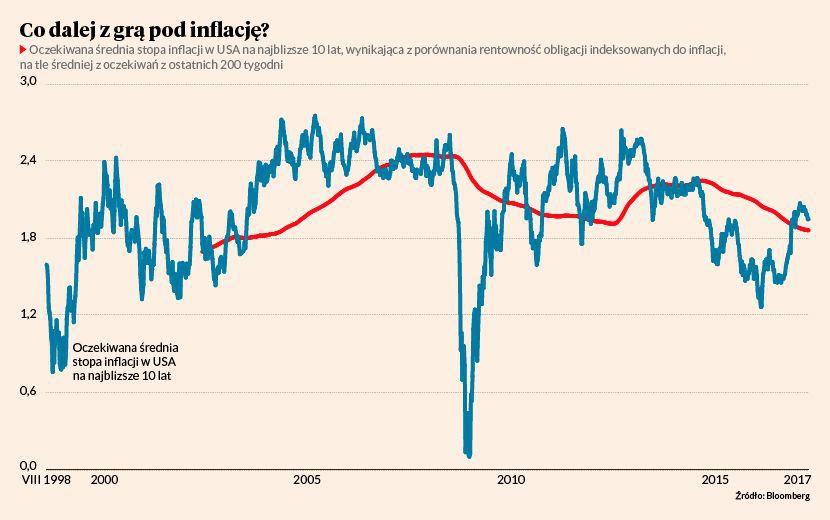 Według Pimco za słabnięciem presji inflacyjnej przemawia także zmiana celów polityki gospodarczej w Chinach. Zamiast wspierać wzrost będzie ona zmierzała do stabilizowania gospodarki, co oznacza powolne wygasanie ubiegłorocznego impulsu kredytowego w gospodarce Państwa Środka. Choć to nie pierwsze prognozy mówiące o zatrzymaniu gry pod inflację, to jednak na szczęście dla inwestujących w akcje (i na nieszczęście dla zwolenników obligacji) oczekujący osłabienia presji inflacyjnej wciąż są jednak w mniejszości. W 2017 r. inflacja w USA przyspieszy do 2,5 proc., z 1,3 proc., zanotowanych w ubiegłym roku, wynika ze średniej prognoz zebranych przez Bloomberga.