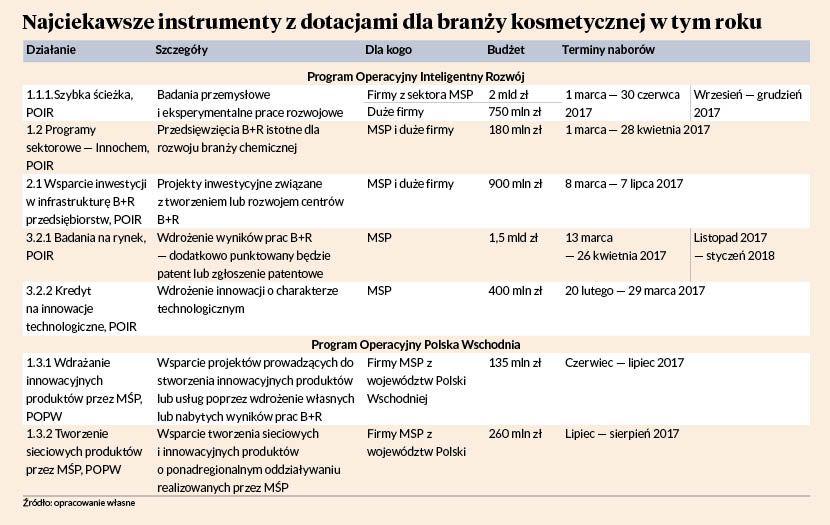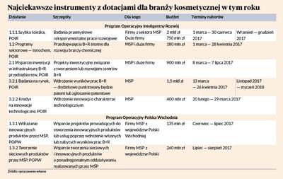 Dodatkowym wsparciem dla branży mogą być dotacje na rozwój biznesu i ekspansję zagraniczną. Ten bardzo innowacyjny sektor może sięgnąć po unijną kasę w wielu instrumentach. Co więcej, firmy kosmetyczne wpisują się w inteligentne specjalizacje, a te traktowane są priorytetowo, jeśli chodzi o przyznawanie wsparcia. Najwięcej dotacyjnych szans daje program Inteligentny Rozwój.