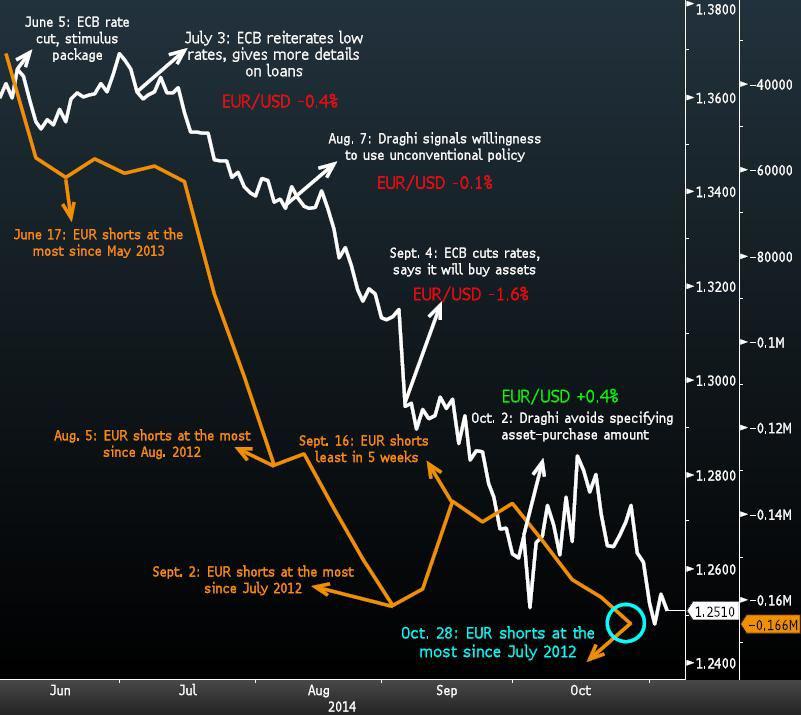 Inwestorzy instytucjonalni oczekują dalszego osłabiania się waluty ze Starego Kontynentu. Liczba krótkich pozycji w euro była na koniec października najwyższa od lipca 2012 r., kiedy przecenę wspólnej waluty zatrzymała deklaracja prezesa EBC Mario Draghiego, który zapowiedział, że zrobi wszystko co możliwe, by uratować euro. Ruchy dużych graczy mogą wskazywać, że dno notowań jest jeszcze przed inwestorami.