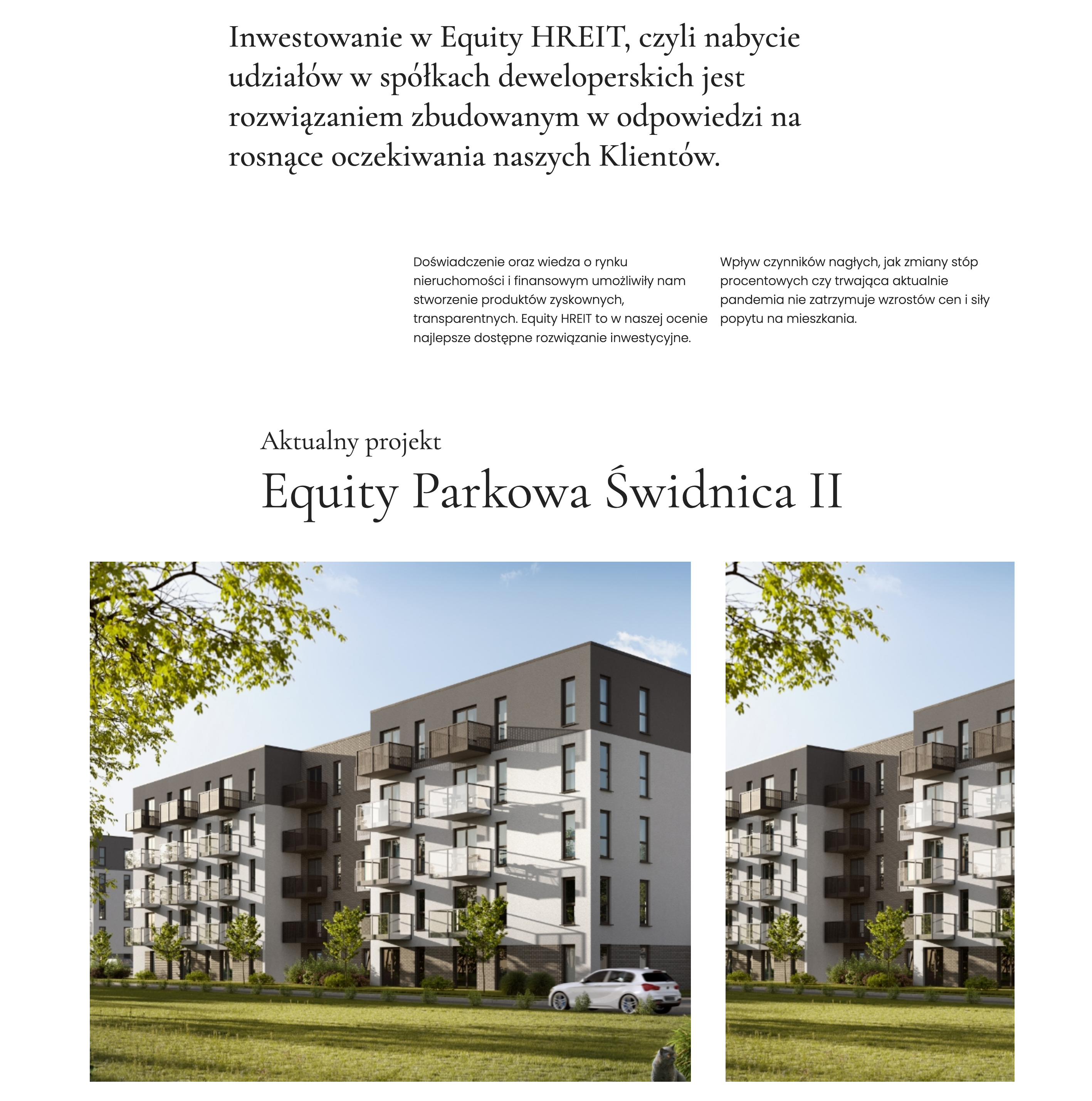O jaką zmianę strategii i przepisów chodzi? Tego szef HRE nie wyjaśnił. (EDYCJA: już po publikacji artykułu otrzymaliśmy kilka sygnałów, że dezaktywacja strony internetowej ma zapewne związek z tym, że od dziś, tj. 10 listopada 2023 r., wchodzi w życie zakaz powszechnego oferowania objęcia udziałów w spółkach z ograniczoną odpowiedzialnością). Pewne jest jednak, że jeszcze 8 listopada 2023 r. na stronie widniała oferta zainwestowania w formule udziałowej w projekt „Parkowa Świdnica II”, który miał dawać roczny zysk na poziomie 9,34 proc. (WIBOR 3M + 3,60 proc.). A w teaserze tej inwestycji można było przeczytać m.in.: „Equity cieszy się nieustającą popularnością wśród naszych Klientów. Jesteśmy dumni, że to już 47. projekt wypracowany wspólnie w formule udziałowej”.