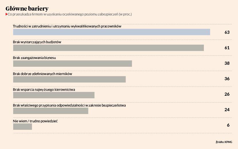 Ponad 9 na 10 osób odpowiedzialnych za bezpieczeństwo IT w firmach, które wzięły udział w badaniu KPMG, wskazało, że największymi cyberzagrożeniami dla przedsiębiorstw są kradzieże danych przez pracowników i złośliwe oprogramowanie szpiegujące lub szyfrujące cyfrowe informacje (ang. ransomware). W czołówce są też ukierunkowane ataki (ang. advanced persistent threat, APT) oraz phishing (metoda oszustwa, w której przestępca podszywa się pod inną osobą lub instytucję w celu wyłudzenia np. danych logowania). Z drugiej strony warto zauważyć, że większość firm bardzo optymistycznie ustosunkowała się do poziomu swoich zabezpieczeń. Najlepiej oceniona została ochrona przed złośliwym oprogramowaniem (97 proc.) oraz ta na styku z siecią (94 proc.). Najgorzej zabezpieczone są działania związane z zarządzaniem bezpieczeństwem w relacjach z partnerami biznesowymi (12 proc.) oraz procesami wytwarzania oprogramowania (13 proc.), które dodatkowo są zagrożone ryzykiem braku wymaganych inwestycji.