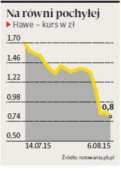 — Jesteśmy w sytuacji finansowej pozwalającej na akwizycję, obserwujemy rynek i jeśli będziemy mieli ciekawe oferty, to je ocenimy — powiedziała tylko Bogusława Matuszewska. Tymczasem Hawe zaliczyło kolejną w tym tygodniu spadkową sesję na GPW. W czwartek kurs spółki poszedł w dół o prawie 6 proc., akcje są o ponad 40 proc. tańsze niż tydzień temu. Przypomnijmy, że we wtorek walne zgromadzenie Hawe przegłosowało emisję aż 160,86 mln nowych akcji z prawem poboru. Cenę emisyjną ustalono na 1 zł, mniejszościowi akcjonariusze zgłosili sprzeciwy do uchwał.