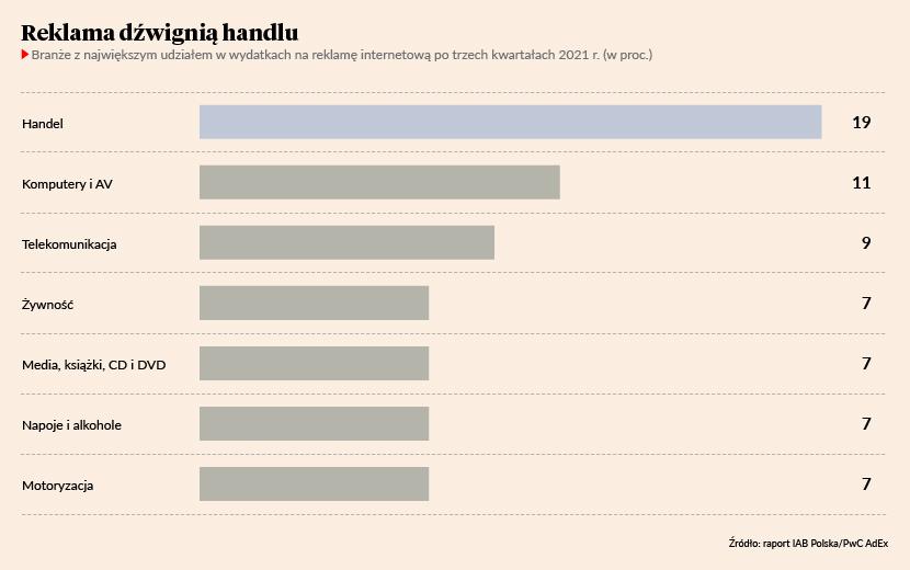 Rekordowe tempo wzrostu rodzimego rynku reklamy online w pierwszym półroczu 2021 r. nie było przypadkowe. W III kw. wydatki firm na tę działalność też się zwiększyły r/r: o 22 proc. — wynika z badania AdEx, autorstwa IAB Polska i PwC. W efekcie w ciągu trzech kwartałów rynek urósł o 22,6 proc. —do 4,3 mld zł. Liderem i kluczowym motorem wzrostu pozostaje reklama graficzna, mająca 45-procentowy udział. Wartość żadnego segmentu nie spadła.