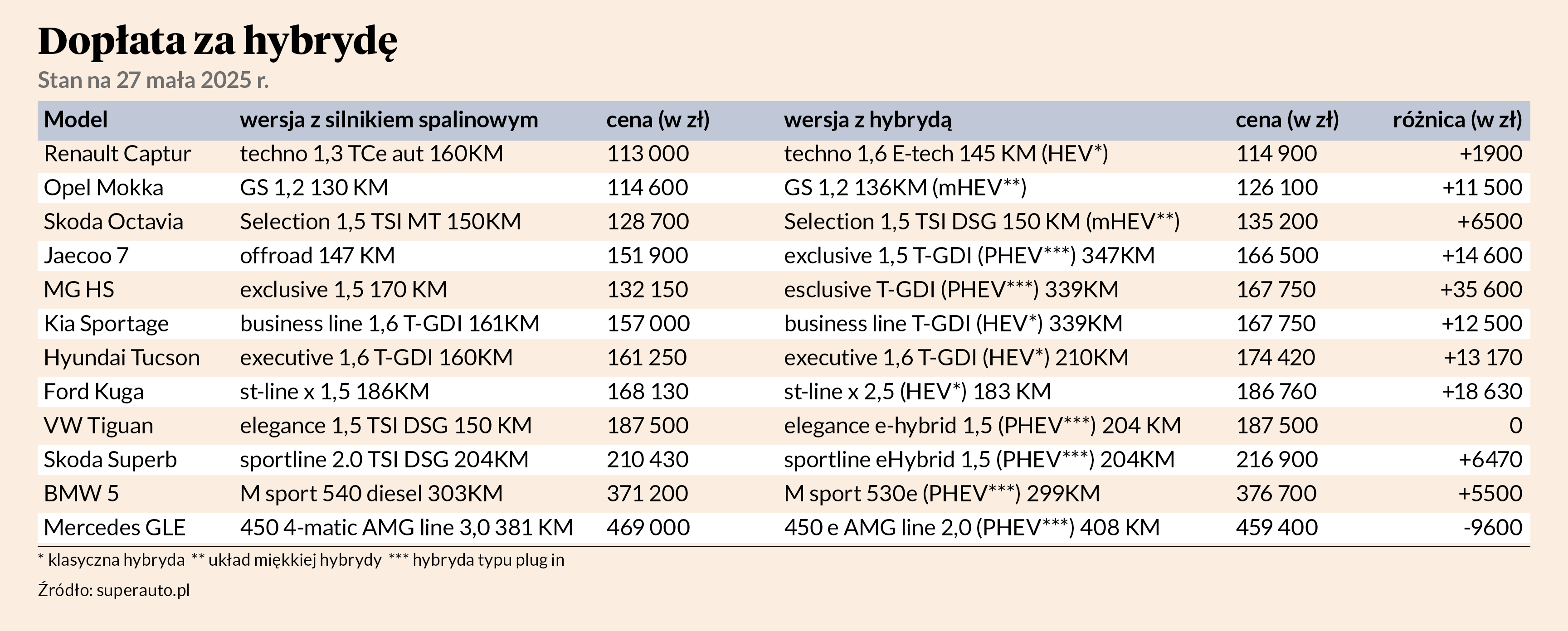 W zestawieniu znalazły się dwa ciekawe przypadki, które zaprzeczają tezie, że hybryda zawsze oznacza większy wydatek. Pierwszym jest VW Tiguan, który w benzynowej wersji Elegance 1.5 TSI DSG kosztuje dokładnie tyle samo ile hybryda Elegance eHybrid 1.5. Jeszcze większą anomalię eksperci wykryli w przypadku Mercedesa GLE — hybrydowa wersja 450 e AMG Line 2.0 kosztuje o 9,6 tys. zł mniej niż benzynowa. Co prawda plug-in ma większą moc, ale wersja benzynowa to auto 7-osobowe z wyższym pakietem wyposażenia.
