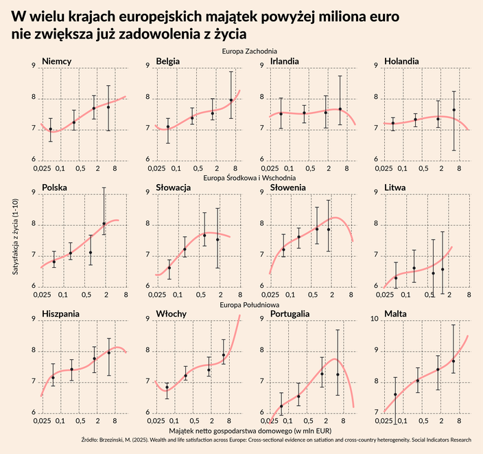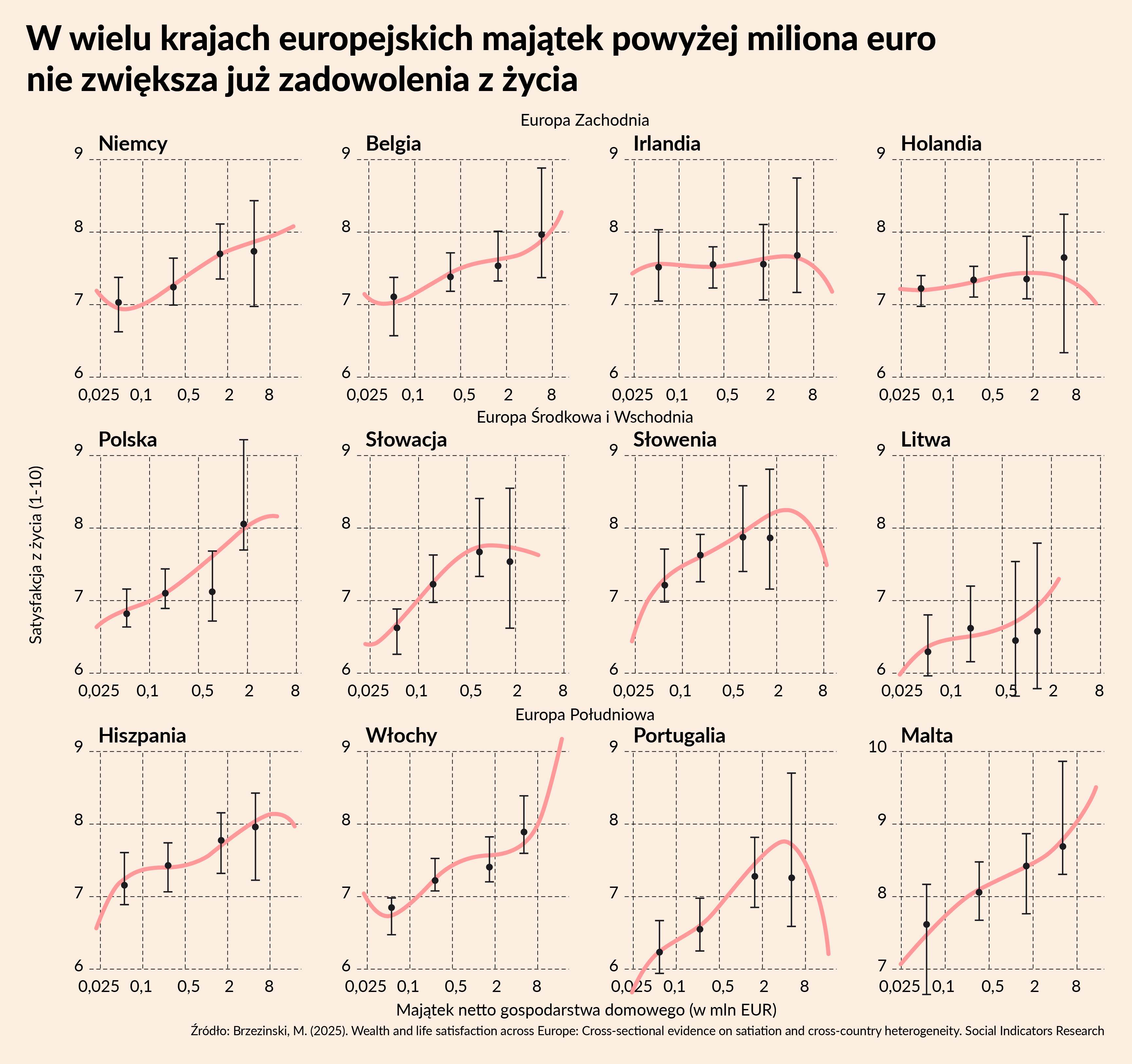 Wniosek jest więc następujący — kontekst kulturowy i społeczny wpływa na sposób postrzegania bogactwa oraz na to, w jakim stopniu materialne dobra — nowe auto, bardziej komfortowe mieszkanie z większym ogródkiem — przekładają się na poczucie zadowolenia. „W większości krajów osoby z majątkiem netto przekraczającym milion euro nie wykazują już wzrostu satysfakcji z życia. Jednak w Hiszpanii, Włoszech i na Malcie nasycenie bogactwem następuje przy znacznie wyższych progach — między 2 a 3 mln EUR. Wskazuje to, że wpływ wysokich zasobów materialnych na dobrobyt jest złożony i znacząco różni się w zależności od kontekstu kulturowego i ekonomicznego” — wskazuje Michał Brzeziński, autor badania.