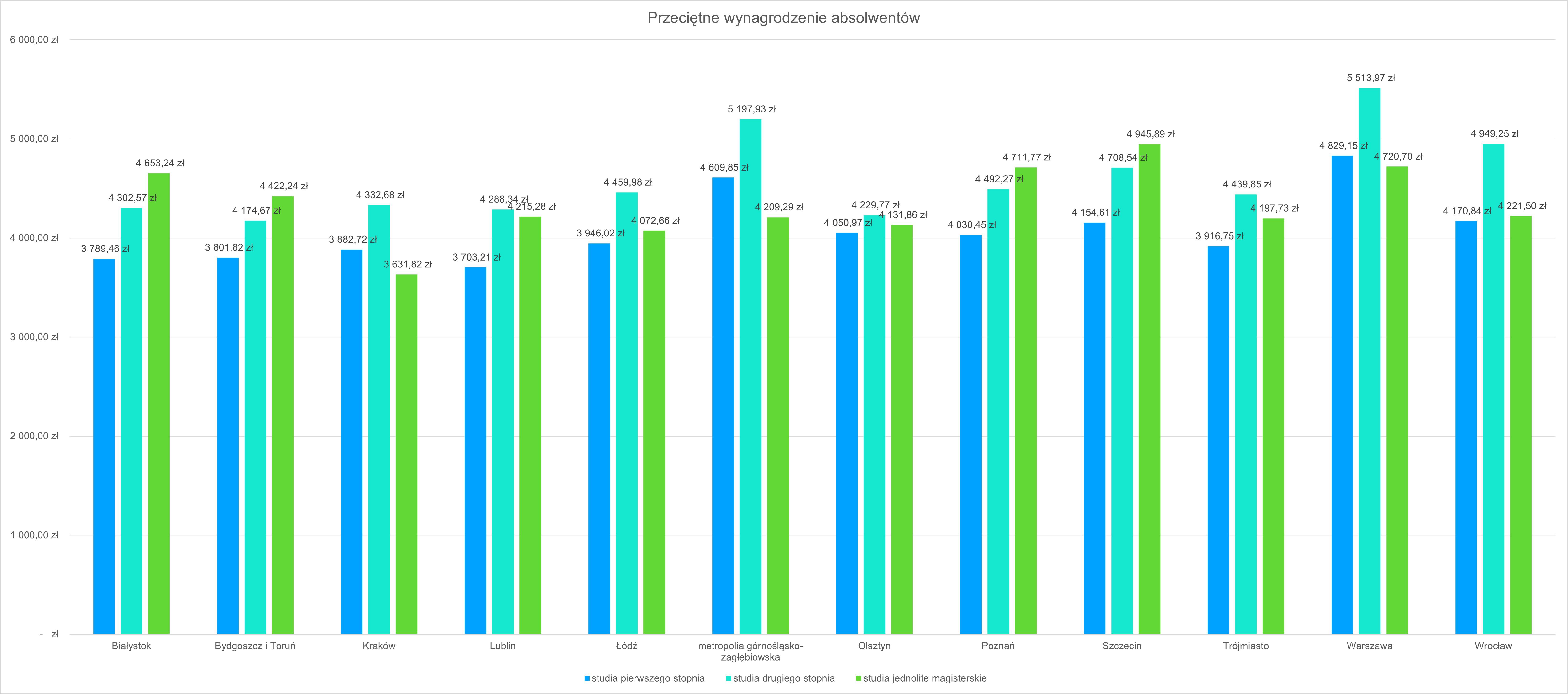 Analiza przeprowadzona przez Program Kariera pokazuje, że to właśnie w Warszawie absolwenci mogą zarobić najwięcej – średnio 5309,57 zł. O prawie 460 zł mniej dostawali na start po zakończeniu szkoły wyższej studenci z Górnego Śląska i Zagłębia. Ich przeciętne zarobki to 4850,97 zł. Natomiast we Wrocławiu pracodawcy proponowali absolwentom 4616,24 zł miesięcznie.