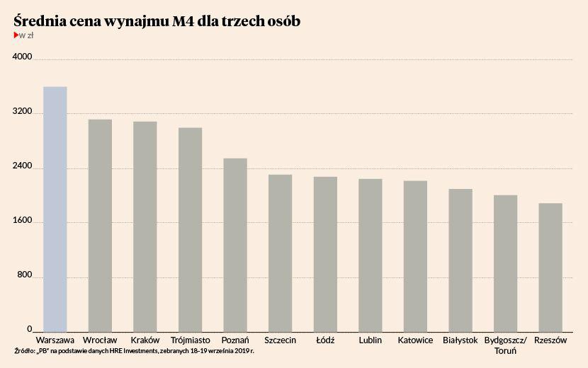 Nie jest niespodzianką, że najdrożej jest w Warszawie, gdzie właściciel M4 może oczekiwać co miesiąc 3,6 tys. zł. W Krakowie i Wrocławiu opłaty są zbliżone i wynoszą po około 3,1 tys. zł miesięcznie. Barierę 3 tys. zł przekracza jeszcze Trójmiasto.
