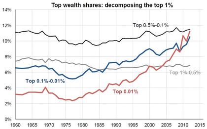 Jego obserwacje potwierdza oparty na danych z gospodarki amerykańskiej wykres sporządzony przez ekonomistów Emmanuela Saeza z Uniwersytetu Kalifornijskiego oraz Gabriela Zucmana z London School of Economics. Według ich obliczeń udział majątków 0,01 proc. najbogatszych Amerykanów w majątku narodowym wzrósł od końca lat 70-tych z niespełna 2,5 proc. do ponad 11 proc. Swoje majątki wolniej powiększali najbogatsi nie zaliczający się do wąskiej elity. Udział „biedniejszej” połowy spośród najbogatszego 1 proc. Amerykanów w majątku narodowym wręcz spadł w porównaniu ze stanem z lat 70-tych.
