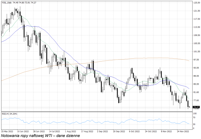Dzisiaj swoje dane na temat zapasów ropy w USA przedstawi Departament Energii. Niemniej, te informacje mogą zejść na dalszy plan, bowiem najwięcej uwagi obecnie przyciągają działania odwetowe Rosji w odpowiedzi na sankcje UE oraz narzucenie limitu cenowego na import rosyjskiej ropy. Na razie nie wiadomo, jaki przyjmą one kształt – Rosja rozważa zarówno wprowadzenie zakazu eksportu ropy do niektórych krajów, jak i wprowadzenie maksymalnego dyskonta. Od zakresu wprowadzonych działań z pewnością będzie zależeć ostateczna produkcja ropy w Rosji – jednak już teraz wiadomo, że jej spadek raczej nie będzie duży, bowiem także Rosji nie zależy na istotnym zmniejszaniu wydobycia.