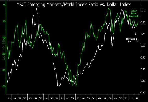 Zdaniem specjalisty era taniego dolara dobiega końca. To zły znak dla wschodzących rynków akcji. Wszystko przez ścisłą odwrotną zależność stosunku indeksów akcji na rynkach wschodzących i dojrzałych oraz indeksu dolara. Mówiąc prosto, umocnienie indeks rynków wschodzących na tle indeksu rynków dojrzałych zwykle zbiega się w czasie z osłabieniem indeksu dolar, mierzącego siłę amerykańskiej waluty w stosunku do walut głównych partnerów handlowych Ameryki.