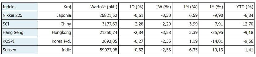 08:41 Giełdy w Azji zakończyły poniedziałkowe notowania relatywnie mocnymi spadkami. Najgorzej sytuacja przedstawiała się w Hongkongu i Szanghaju.