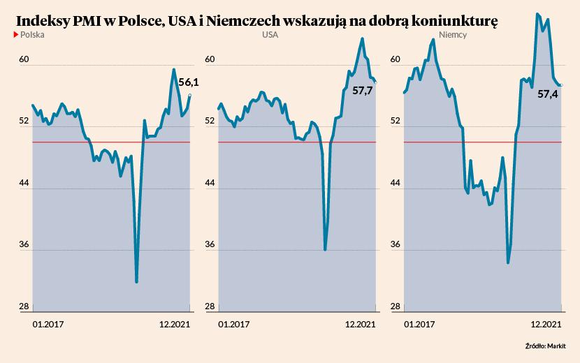 W innych krajach PMI nie rośnie tak jak w Polsce, ale za to często jest na wyższych poziomach. Na przykład, w Niemczech indeks utrzymał się w grudniu na poziomie 57,4 pkt, czyli znacznie powyżej średniej historycznej. W USA indeks lekko spadł, ale jest też bardzo wysoko. W Chinach PMI nieznacznie wzrósł, choć znajduje się niżej niż w USA czy Niemczech. Ogólny obraz koniunktury przemysłu jest generalnie bardzo dobry, choć Chiny ewidentnie zostają w tyle stawki, w przeciwieństwie do sytuacji z pierwszych miesięcy pandemii.