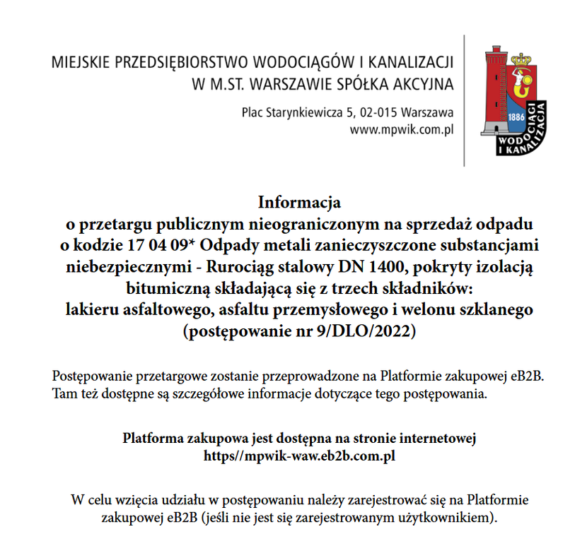 Informacja o przetargu publicznym nieograniczonym na sprzedaż odpadu o kodzie 17 04 09* Komunikat partneraopublikowano: 2022-12-16 14:30PosłuchajZostań subskrybentemi słuchaj tego oraz wielu innych artykułów w pb.pl