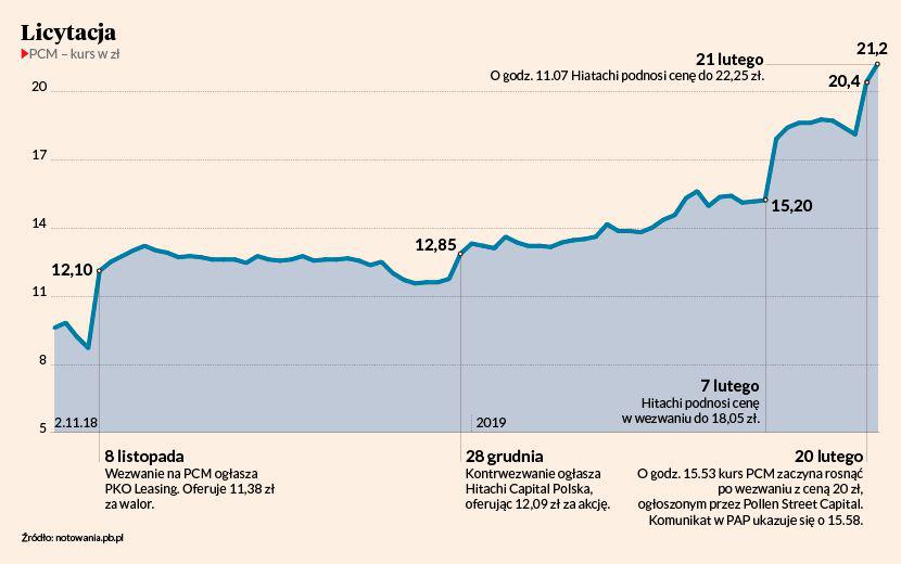 W środę 20 lutego apetyt na PCM ujawnił fundusz Pollen Street Capital (PSC). Za jedną akcję zaproponował równe 20 zł, a wezwanie będzie prowadził w marcu i kwietniu. Zawierająca cenę, jednozdaniowa informacja o wezwaniu PSC została przekazana w płatnym serwisie przez Polską Agencję Prasową (PAP) o godz. 15.53. Dwie minuty później pojawiła się w agencji Bloomberg, która ma z PAP umowę o współpracy. Dopiero o 15.58 została przez PAP upubliczniona pełna treść wezwania PSC i wtedy też każdy mógł się z nią zapoznać.