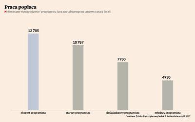 — Popyt na rynku IT przewyższa podaż adekwatnych kandydatów przede wszystkim ze względu na brak dopasowania kwalifikacji i doświadczenia do potrzeb pracodawców oraz wynagrodzenia przekraczające możliwości finansowe przedsiębiorcy. Najlepsi kandydaci to osoby, które ukończyły studia informatyczne, biegle posługują się językiem angielskim i mają racjonalne oczekiwania finansowe — mówi Aleksandra Kujawa, business unit manager w Antal IT Services. Z wyliczeń firmy Sedlak & Sedlak wynika, że przeciętna wartość miesięcznego wynagrodzenia brutto programisty baz danych wynosi 6773 zł. Dla porównania, średnia płaca w sektorze przedsiębiorstw wyniosła w sierpniu 4492 zł (dane GUS). Około 6,7 tys. brutto dla programisty to mediana — 50 proc. osób zarabia mniej, a 50 proc. więcej. Jedna czwarta zarabia jednak powyżej 9032 zł miesięcznie, a jedna czwarta najgorzej wynagradzanych poniżej 4572 zł. Kryteria różnicujące to m.in. wykształcenie, staż pracy czy miejsce zatrudnienia, przy czym w ostatnim przypadku chodzi nie tylko o wielkość i kondycję finansową firm, liczy się także region zatrudnienia (średnie stawki dla specjalistów programujących w języku Java w podziale na konkretne stanowiska w infografice). Na starcie nie ma jednak fajerwerków. Zdaniem ekspertki z Antal IT services, młode osoby rozpoczynające swoją przygodę w tej branży powinny nastawiać się na 2-3 tys. brutto miesięcznie.